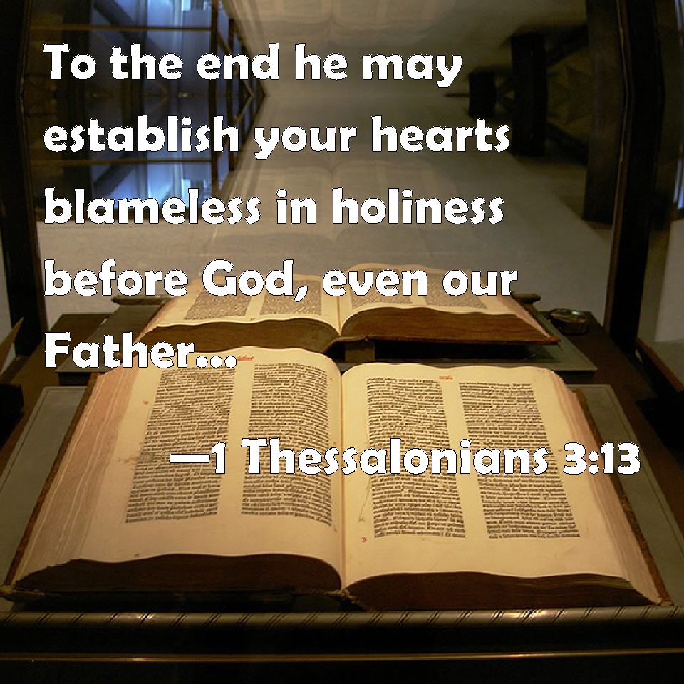 Choose a Background 1 Thessalonians 3:13 To the end he may establish your hearts blameless in holiness before God, even our Father, at the coming of our Lord Jesus Christ with all his saints. KJV: To the end he may stablish your hearts unblameable in holiness before God, even our Father, at the coming of our Lord Jesus Christ with all his saints. DRB: To confirm your hearts without blame, in holiness, before God and our Father, at the coming of our Lord Jesus Christ, with all his saints. Amen. DBT: in order to the confirming of your hearts unblamable in holiness before our God and Father at the coming of our Lord Jesus with all his saints. ERV: to the end he may stablish your hearts unblameable in holiness before our God and Father, at the coming of our Lord Jesus with all his saints. WBT: To the end he may establish your hearts unblamable in holiness before God, even our Father, at the coming of our Lord Jesus Christ with all his saints. WEB: to the end he may establish your hearts blameless in holiness before our God and Father, at the coming of our Lord Jesus with all his saints. YLT: to the establishing your hearts blameless in sanctification before our God and Father, in the presence of our Lord Jesus Christ with all His saints.Links 1 Thessalonians 3:13 NIV • 1 Thessalonians 3:13 NLT • 1 Thessalonians 3:13 ESV • 1 Thessalonians 3:13 NASB • 1 Thessalonians 3:13 KJV • 1 Thessalonians 3:13 Interlinear • 1 Thessalonians 3:13 Commentaries • 1 Thessalonians 3:13 Parallel Texts • 1 Thessalonians 3:13 Bible Apps • 1 Thessalonians 3:13 Parallel • Bible Hub |