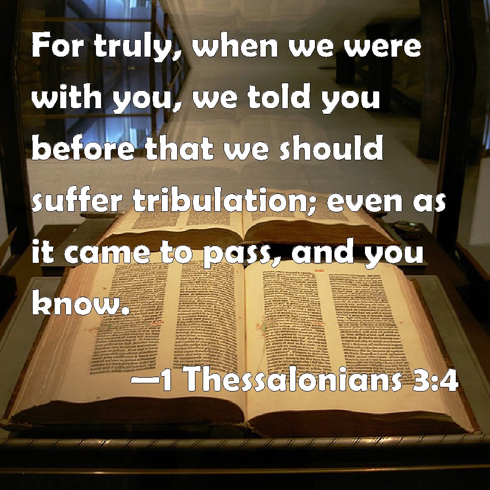 Choose a Background 1 Thessalonians 3:4 For truly, when we were with you, we told you before that we should suffer tribulation; even as it came to pass, and you know. KJV: For verily, when we were with you, we told you before that we should suffer tribulation; even as it came to pass, and ye know. DRB: For even when we were with you, we foretold you that we should suffer tribulations, as also it is come to pass, and you know. DBT: for also, when we were with you, we told you beforehand we are about to be in tribulation, even as also it came to pass, and ye know.) ERV: For verily, when we were with you, we told you beforehand that we are to suffer affliction; even as it came to pass, and ye know. WBT: For verily, when we were with you, we told you before that we should suffer tribulation; even as it came to pass, and ye know. WEB: For most certainly, when we were with you, we told you beforehand that we are to suffer affliction, even as it happened, and you know. YLT: for even when we were with you, we said to you beforehand, that we are about to suffer tribulation, as also it did come to pass, and ye have known it;Links 1 Thessalonians 3:4 NIV • 1 Thessalonians 3:4 NLT • 1 Thessalonians 3:4 ESV • 1 Thessalonians 3:4 NASB • 1 Thessalonians 3:4 KJV • 1 Thessalonians 3:4 Interlinear • 1 Thessalonians 3:4 Commentaries • 1 Thessalonians 3:4 Parallel Texts • 1 Thessalonians 3:4 Bible Apps • 1 Thessalonians 3:4 Parallel • Bible Hub |