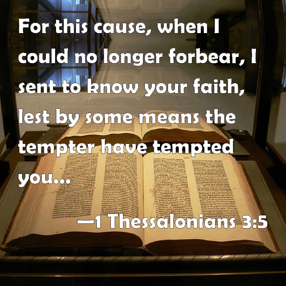 Choose a Background 1 Thessalonians 3:5 For this cause, when I could no longer forbear, I sent to know your faith, lest by some means the tempter have tempted you, and our labor be in vain. KJV: For this cause, when I could no longer forbear, I sent to know your faith, lest by some means the tempter have tempted you, and our labour be in vain. DRB: For this cause also, I, forbearing no longer, sent to know your faith: lest perhaps he that tempteth should have tempted you, and our labour should be made vain. DBT: For this reason I also, no longer able to refrain myself, sent to know your faith, lest perhaps the tempter had tempted you and our labour should be come to nothing. ERV: For this cause I also, when I could no longer forbear, sent that I might know your faith, lest by any means the tempter had tempted you, and our labour should be in vain. WBT: For this cause, when I could no longer forbear, I sent to know your faith, lest by some means the tempter may have tempted you, and our labor be in vain. WEB: For this cause I also, when I couldn't stand it any longer, sent that I might know your faith, for fear that by any means the tempter had tempted you, and our labor would have been in vain. YLT: because of this also, I, no longer forbearing, did send to know your faith, lest he who is tempting did tempt you, and in vain might be our labour.Links 1 Thessalonians 3:5 NIV • 1 Thessalonians 3:5 NLT • 1 Thessalonians 3:5 ESV • 1 Thessalonians 3:5 NASB • 1 Thessalonians 3:5 KJV • 1 Thessalonians 3:5 Interlinear • 1 Thessalonians 3:5 Commentaries • 1 Thessalonians 3:5 Parallel Texts • 1 Thessalonians 3:5 Bible Apps • 1 Thessalonians 3:5 Parallel • Bible Hub |