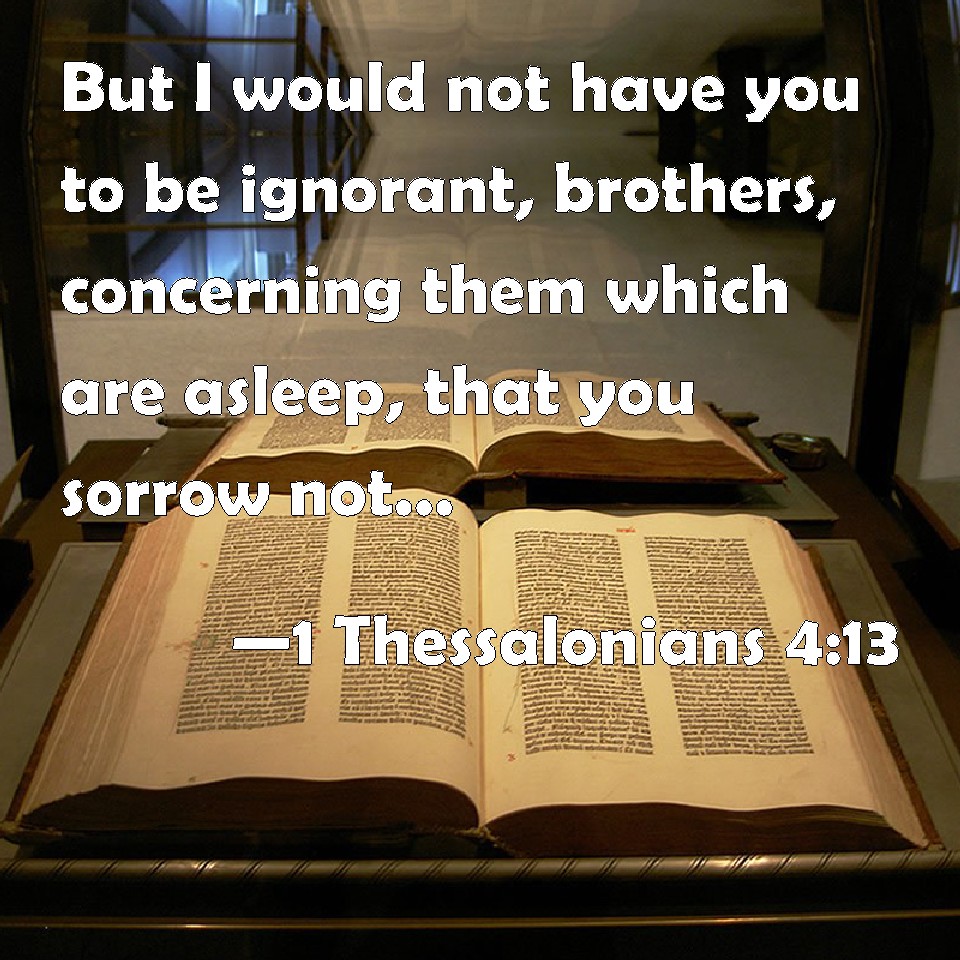 Choose a Background 1 Thessalonians 4:13 But I would not have you to be ignorant, brothers, concerning them which are asleep, that you sorrow not, even as others which have no hope. KJV: But I would not have you to be ignorant, brethren, concerning them which are asleep, that ye sorrow not, even as others which have no hope. DRB: And we will not have you ignorant, brethren, concerning them that are asleep, that you be not sorrowful, even as others who have no hope. DBT: But we do not wish you to be ignorant, brethren, concerning them that are fallen asleep, to the end that ye be not grieved even as also the rest who have no hope. ERV: But we would not have you ignorant, brethren, concerning them that fall asleep; that ye sorrow not, even as the rest, which have no hope. WBT: But I would not have you to be ignorant, brethren, concerning them who are asleep, that ye sorrow not, even as others who have no hope. WEB: But we don't want you to be ignorant, brothers, concerning those who have fallen asleep, so that you don't grieve like the rest, who have no hope. YLT: And I do not wish you to be ignorant, brethren, concerning those who have fallen asleep, that ye may not sorrow, as also the rest who have not hope,Links 1 Thessalonians 4:13 NIV • 1 Thessalonians 4:13 NLT • 1 Thessalonians 4:13 ESV • 1 Thessalonians 4:13 NASB • 1 Thessalonians 4:13 KJV • 1 Thessalonians 4:13 Interlinear • 1 Thessalonians 4:13 Commentaries • 1 Thessalonians 4:13 Parallel Texts • 1 Thessalonians 4:13 Bible Apps • 1 Thessalonians 4:13 Parallel • Bible Hub |
