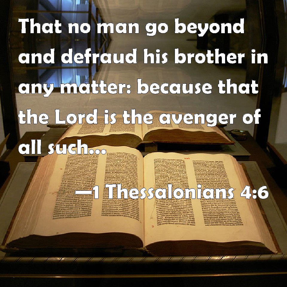 Choose a Background 1 Thessalonians 4:6 That no man go beyond and defraud his brother in any matter: because that the Lord is the avenger of all such, as we also have forewarned you and testified. KJV: That no man go beyond and defraud his brother in any matter: because that the Lord is the avenger of all such, as we also have forewarned you and testified. DRB: And that no man overreach, nor circumvent his brother in business: because the Lord is the avenger of all these things, as we have told you before, and have testified. DBT: not overstepping the rights of and wronging his brother in the matter, because the Lord is the avenger of all these things, even as we also told you before, and have fully testified. ERV: that no man transgress, and wrong his brother in the matter: because the Lord is an avenger in all these things, as also we forewarned you and testified. WBT: That no man go beyond and defraud his brother in any matter: because the Lord is the avenger of all such, as we also have forewarned you and testified. WEB: that no one should take advantage of and wrong a brother or sister in this matter; because the Lord is an avenger in all these things, as also we forewarned you and testified. YLT: that no one go beyond and defraud in the matter his brother, because an avenger is the Lord of all these, as also we spake before to you and testified,Links 1 Thessalonians 4:6 NIV • 1 Thessalonians 4:6 NLT • 1 Thessalonians 4:6 ESV • 1 Thessalonians 4:6 NASB • 1 Thessalonians 4:6 KJV • 1 Thessalonians 4:6 Interlinear • 1 Thessalonians 4:6 Commentaries • 1 Thessalonians 4:6 Parallel Texts • 1 Thessalonians 4:6 Bible Apps • 1 Thessalonians 4:6 Parallel • Bible Hub |