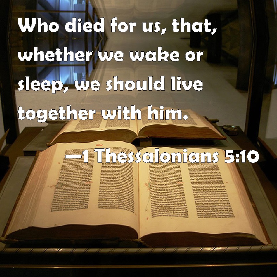 Choose a Background 1 Thessalonians 5:10 Who died for us, that, whether we wake or sleep, we should live together with him. KJV: Who died for us, that, whether we wake or sleep, we should live together with him. DRB: Who died for us; that, whether we watch or sleep, we may live together with him. DBT: who has died for us, that whether we may be watching or sleep, we may live together with him. ERV: who died for us, that, whether we wake or sleep, we should live together with him. WBT: Who died for us, that, whether we wake or sleep, we should live together with him. WEB: who died for us, that, whether we wake or sleep, we should live together with him. YLT: who did die for us, that whether we wake — whether we sleep — together with him we may live;Links 1 Thessalonians 5:10 NIV • 1 Thessalonians 5:10 NLT • 1 Thessalonians 5:10 ESV • 1 Thessalonians 5:10 NASB • 1 Thessalonians 5:10 KJV • 1 Thessalonians 5:10 Interlinear • 1 Thessalonians 5:10 Commentaries • 1 Thessalonians 5:10 Parallel Texts • 1 Thessalonians 5:10 Bible Apps • 1 Thessalonians 5:10 Parallel • Bible Hub |