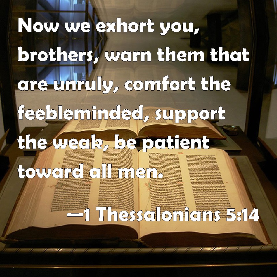 Choose a Background 1 Thessalonians 5:14 Now we exhort you, brothers, warn them that are unruly, comfort the feebleminded, support the weak, be patient toward all men. KJV: Now we exhort you, brethren, warn them that are unruly, comfort the feebleminded, support the weak, be patient toward all men. DRB: And we beseech you, brethren, rebuke the unquiet, comfort the feeble minded, support the weak, be patient towards all men. DBT: But we exhort you, brethren, admonish the disorderly, comfort the faint-hearted, sustain the weak, be patient towards all. ERV: And we exhort you, brethren, admonish the disorderly, encourage the fainthearted, support the weak, be longsuffering toward all. WBT: Now we exhort you, brethren, warn them that are disorderly, comfort the feeble-minded, support the weak, be patient towards all men. WEB: We exhort you, brothers, admonish the disorderly, encourage the fainthearted, support the weak, be patient toward all. YLT: and we exhort you, brethren, admonish the disorderly, comfort the feeble-minded, support the infirm, be patient unto all;Links 1 Thessalonians 5:14 NIV • 1 Thessalonians 5:14 NLT • 1 Thessalonians 5:14 ESV • 1 Thessalonians 5:14 NASB • 1 Thessalonians 5:14 KJV • 1 Thessalonians 5:14 Interlinear • 1 Thessalonians 5:14 Commentaries • 1 Thessalonians 5:14 Parallel Texts • 1 Thessalonians 5:14 Bible Apps • 1 Thessalonians 5:14 Parallel • Bible Hub |