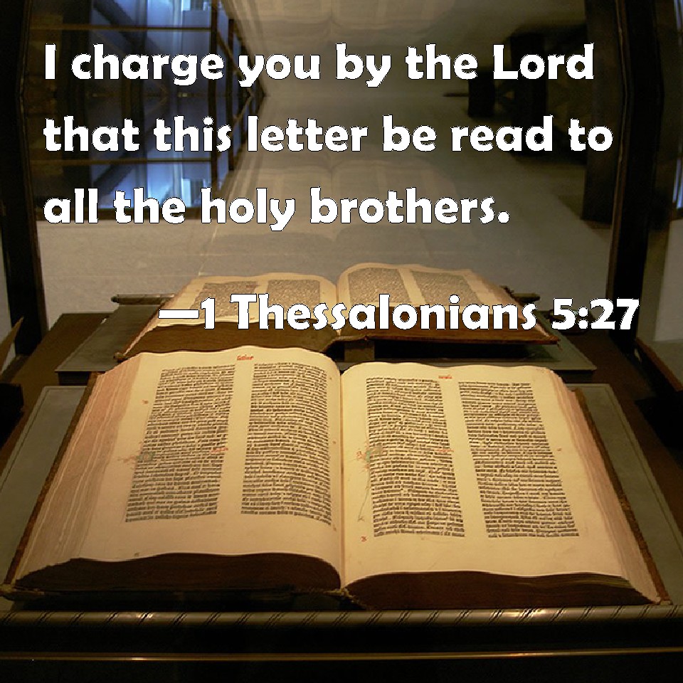 1 Thessalonians 5:27 I charge you by the Lord that this letter be read to all the holy brothers.