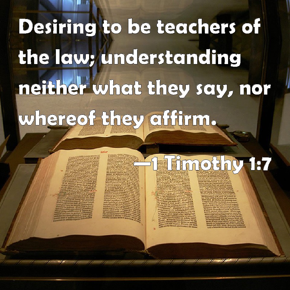 Choose a Background 1 Timothy 1:7 Desiring to be teachers of the law; understanding neither what they say, nor whereof they affirm. KJV: Desiring to be teachers of the law; understanding neither what they say, nor whereof they affirm. DRB: Desiring to be teachers of the law, understanding neither the things they say, nor whereof they affirm. DBT: desiring to be law-teachers, not understanding either what they say or concerning what they so strenuously affirm. ERV: desiring to be teachers of the law, though they understand neither what they say, nor whereof they confidently affirm. WBT: Desiring to be teachers of the law; understanding neither what they say, nor concerning what they affirm. WEB: desiring to be teachers of the law, though they understand neither what they say, nor about what they strongly affirm. YLT: willing to be teachers of law, not understanding either the things they say, nor concerning what they asseverate,Links 1 Timothy 1:7 NIV • 1 Timothy 1:7 NLT • 1 Timothy 1:7 ESV • 1 Timothy 1:7 NASB • 1 Timothy 1:7 KJV • 1 Timothy 1:7 Interlinear • 1 Timothy 1:7 Commentaries • 1 Timothy 1:7 Parallel Texts • 1 Timothy 1:7 Bible Apps • 1 Timothy 1:7 Parallel • Bible Hub |
