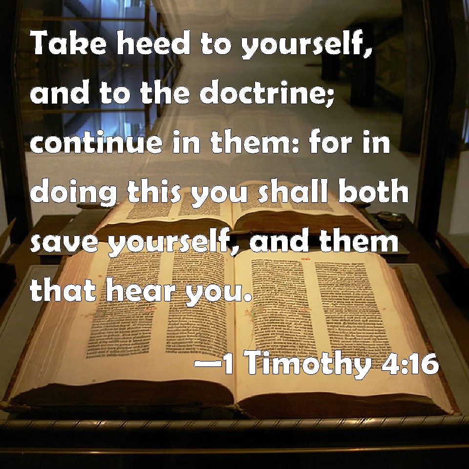 Choose a Background 1 Timothy 4:16 Take heed to yourself, and to the doctrine; continue in them: for in doing this you shall both save yourself, and them that hear you. KJV: Take heed unto thyself, and unto the doctrine; continue in them: for in doing this thou shalt both save thyself, and them that hear thee. DRB: Take heed to thyself and to doctrine: be earnest in them. For in doing this thou shalt both save thyself and them that hear thee. DBT: Give heed to thyself and to the teaching; continue in them; for, doing this, thou shalt save both thyself and those that hear thee. ERV: Take heed to thyself, and to thy teaching. Continue in these things; for in doing this thou shalt save both thyself and them that hear thee. WBT: Take heed to thyself and to thy doctrine; continue in them: for in doing this thou wilt both save thyself, and them that hear thee. WEB: Pay attention to yourself, and to your teaching. Continue in these things, for in doing this you will save both yourself and those who hear you. YLT: take heed to thyself, and to the teaching; remain in them, for this thing doing, both thyself thou shalt save, and those hearing thee.Links 1 Timothy 4:16 NIV • 1 Timothy 4:16 NLT • 1 Timothy 4:16 ESV • 1 Timothy 4:16 NASB • 1 Timothy 4:16 KJV • 1 Timothy 4:16 Interlinear • 1 Timothy 4:16 Commentaries • 1 Timothy 4:16 Parallel Texts • 1 Timothy 4:16 Bible Apps • 1 Timothy 4:16 Parallel • Bible Hub |