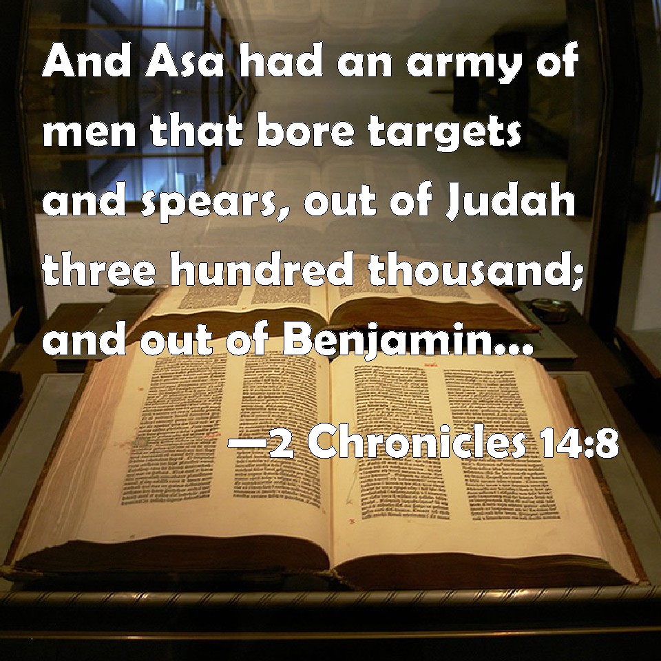 Choose a Background 2 Chronicles 14:8 And Asa had an army of men that bore targets and spears, out of Judah three hundred thousand; and out of Benjamin, that bore shields and drew bows, two hundred and fourscore thousand: all these were mighty men of valor. KJV: And Asa had an army of men that bare targets and spears, out of Judah three hundred thousand; and out of Benjamin, that bare shields and drew bows, two hundred and fourscore thousand: all these were mighty men of valour. DRB: And Asa had in his army of men that bore shields and spears of Juda three hundred thousand, and of Benjamin that bore shields and drew bows, two hundred and eighty thousand, all these were most valiant men. DBT: And Asa had an army that bore targets and spears: out of Judah three hundred thousand; and out of Benjamin, that bore shields and drew the bow, two hundred and eighty thousand: all these, mighty men of valour. ERV: And Asa had an army that bare bucklers and spears, out of Judah three hundred thousand; and out of Benjamin, that bare shields and drew bows, two hundred and fourscore thousand: an these were mighty men of valour. WBT: And Asa had an army of men that bore targets and spears, out of Judah three hundred thousand; and out of Benjamin, that bore shields and drew bows, two hundred and eighty thousand: all these were mighty men of valor. WEB: Asa had an army that bore bucklers and spears, out of Judah three hundred thousand; and out of Benjamin, that bore shields and drew bows, two hundred eighty thousand: all these were mighty men of valor. YLT: And there is to Asa a force bearing target and spear, out of Judah three hundred thousand, and out of Benjamin, bearing shield and treading bow, two hundred and eighty thousand: all these are mighty of valour.Links 2 Chronicles 14:8 NIV • 2 Chronicles 14:8 NLT • 2 Chronicles 14:8 ESV • 2 Chronicles 14:8 NASB • 2 Chronicles 14:8 KJV • 2 Chronicles 14:8 Interlinear • 2 Chronicles 14:8 Commentaries • 2 Chronicles 14:8 Parallel Texts • 2 Chronicles 14:8 Bible Apps • 2 Chronicles 14:8 Parallel • Bible Hub |