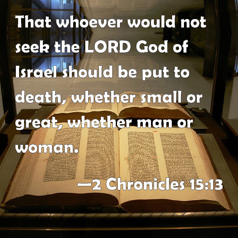 Choose a Background 2 Chronicles 15:13 That whoever would not seek the LORD God of Israel should be put to death, whether small or great, whether man or woman. KJV: That whosoever would not seek the LORD God of Israel should be put to death, whether small or great, whether man or woman. DRB: And if any one, said he, seek not the Lord the God of Israel, let him die, whether little or great, man or woman. DBT: and that whoever would not seek Jehovah the God of Israel should be put to death, whether small or great, whether man or woman. ERV: and that whosoever would not seek the LORD, the God of Israel, should be put to death, whether small or great, whether man or woman. WBT: That whoever would not seek the LORD God of Israel should be put to death, whether small or great, whether man or woman. WEB: and that whoever would not seek Yahweh, the God of Israel, should be put to death, whether small or great, whether man or woman. YLT: and every one who doth not seek for Jehovah, God of Israel, is put to death, from small unto great, from man unto woman.Links 2 Chronicles 15:13 NIV • 2 Chronicles 15:13 NLT • 2 Chronicles 15:13 ESV • 2 Chronicles 15:13 NASB • 2 Chronicles 15:13 KJV • 2 Chronicles 15:13 Interlinear • 2 Chronicles 15:13 Commentaries • 2 Chronicles 15:13 Parallel Texts • 2 Chronicles 15:13 Bible Apps • 2 Chronicles 15:13 Parallel • Bible Hub |