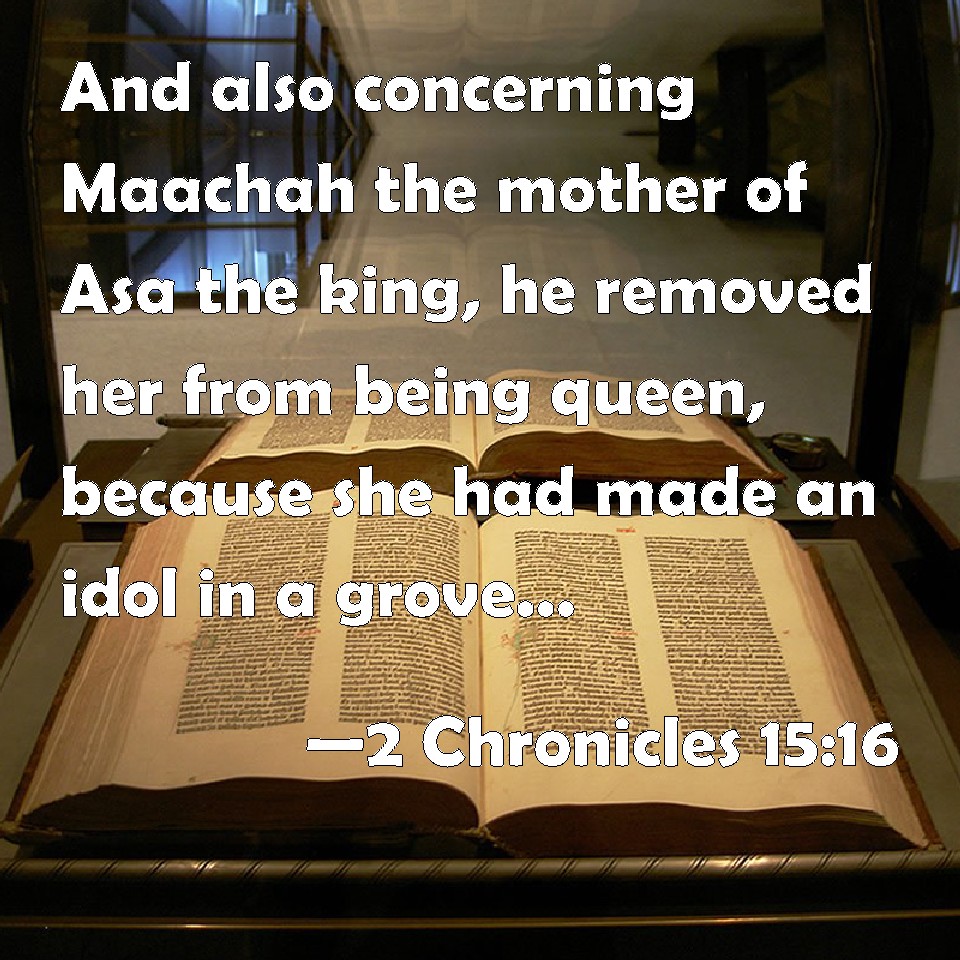 Choose a Background 2 Chronicles 15:16 And also concerning Maachah the mother of Asa the king, he removed her from being queen, because she had made an idol in a grove: and Asa cut down her idol, and stamped it, and burnt it at the brook Kidron. KJV: And also concerning Maachah the mother of Asa the king, he removed her from being queen, because she had made an idol in a grove: and Asa cut down her idol, and stamped it, and burnt it at the brook Kidron. DRB: Moreover Maacha the mother of king Asa he deposed from the royal authority, because she had made in a grove an idol of Priapus: and he entirely destroyed it, and breaking it into pieces, burnt it at the torrent Cedron. DBT: And also Maachah, the mother of Asa the king, he removed from being queen, because she had made an idol for the Asherah; and Asa cut down her idol, and stamped it, and burned it in the valley Kidron. ERV: And also Maacah the mother of Asa the king, he removed her from being queen, because she had made an abominable image for an Asherah; and Asa cut down her image, and made dust of it, and burnt it at the brook Kidron. WBT: And also concerning Maachah the mother of Asa the king, he removed her from being queen, because she had made an idol in a grove: and Asa cut down her idol, and stamped it, and burnt it at the brook Kidron. WEB: Also Maacah, the mother of Asa the king, he removed from being queen, because she had made an abominable image for an Asherah; and Asa cut down her image, and made dust of it, and burnt it at the brook Kidron. YLT: And also Maachah, mother of Asa the king — he hath removed her from being mistress, in that she hath made for a shrine a horrible thing, and Asa cutteth down her horrible thing, and beateth it small, and burneth it by the brook Kidron:Links 2 Chronicles 15:16 NIV • 2 Chronicles 15:16 NLT • 2 Chronicles 15:16 ESV • 2 Chronicles 15:16 NASB • 2 Chronicles 15:16 KJV • 2 Chronicles 15:16 Interlinear • 2 Chronicles 15:16 Commentaries • 2 Chronicles 15:16 Parallel Texts • 2 Chronicles 15:16 Bible Apps • 2 Chronicles 15:16 Parallel • Bible Hub |