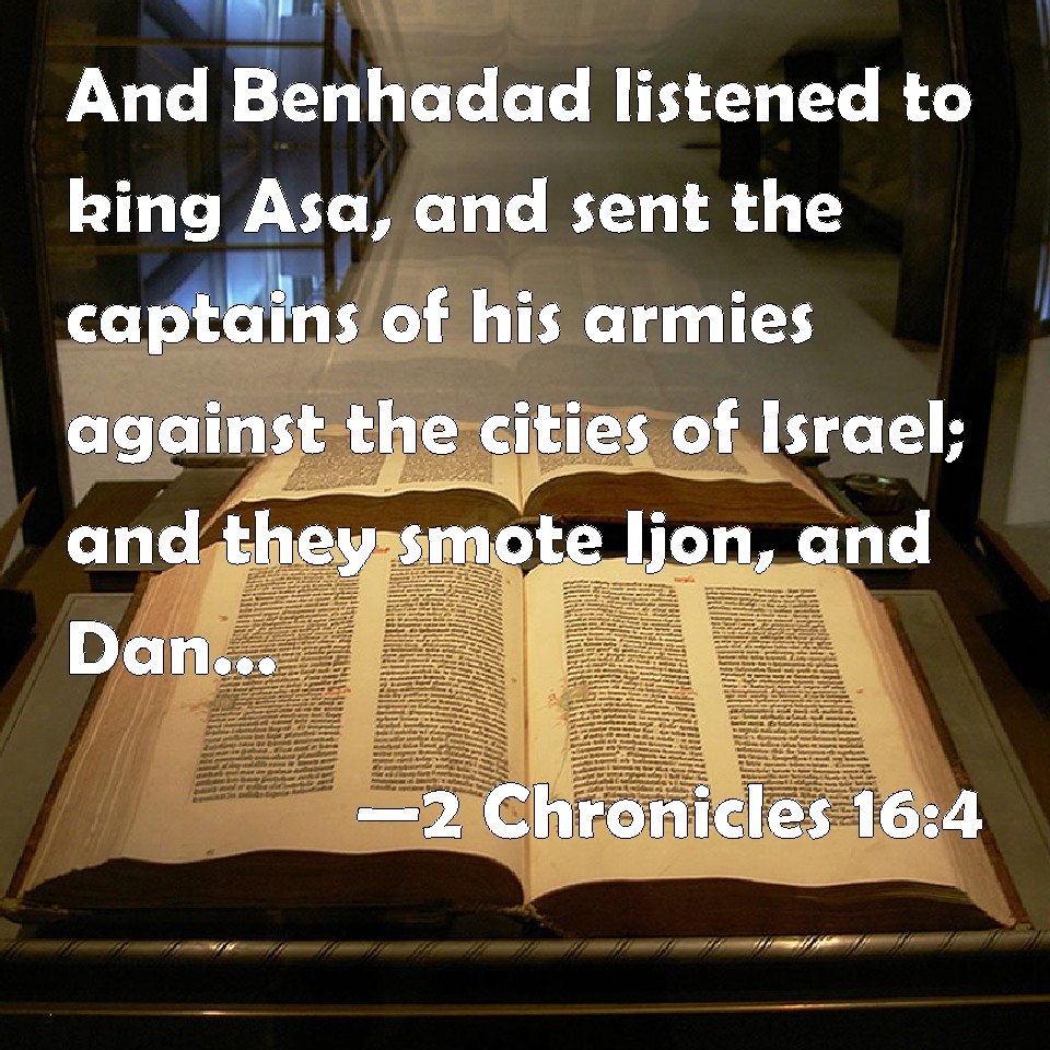 Choose a Background 2 Chronicles 16:4 And Benhadad listened to king Asa, and sent the captains of his armies against the cities of Israel; and they smote Ijon, and Dan, and Abelmaim, and all the store cities of Naphtali. KJV: And Benhadad hearkened unto king Asa, and sent the captains of his armies against the cities of Israel; and they smote Ijon, and Dan, and Abelmaim, and all the store cities of Naphtali. DRB: And then Benadad heard this, he sent the captains of his armies against the cities of Israel: and they took Ahion, and Dan, and Abelmaim, and all the walled cities of Nephtali. DBT: And Ben-hadad hearkened to king Asa, and sent the captains of his forces against the cities of Israel; and they smote Ijon and Dan and Abelmaim, and all the store-magazines of the cities of Naphtali. ERV: And Ben-hadad hearkened unto king Asa, and sent the captains of his armies against the cities of Israel; and they smote Ijon, and Dan, and Abel-maim, and all the store cities of Naphtali. WBT: And Ben-hadad hearkened to king Asa, and sent the captains of his armies against the cities of Israel; and they smote Ijon, and Dan, and Abelmaim, and all the store cities of Naphtali. WEB: Ben Hadad listened to king Asa, and sent the captains of his armies against the cities of Israel; and they struck Ijon, and Dan, and Abel Maim, and all the storage cities of Naphtali. YLT: And Ben-Hadad hearkeneth unto king Asa, and sendeth the heads of the forces that he hath unto cities of Israel, and they smite Ijon, and Dan, and Abel-Maim, and all the stores, cities of Naphtali.Links 2 Chronicles 16:4 NIV • 2 Chronicles 16:4 NLT • 2 Chronicles 16:4 ESV • 2 Chronicles 16:4 NASB • 2 Chronicles 16:4 KJV • 2 Chronicles 16:4 Interlinear • 2 Chronicles 16:4 Commentaries • 2 Chronicles 16:4 Parallel Texts • 2 Chronicles 16:4 Bible Apps • 2 Chronicles 16:4 Parallel • Bible Hub |