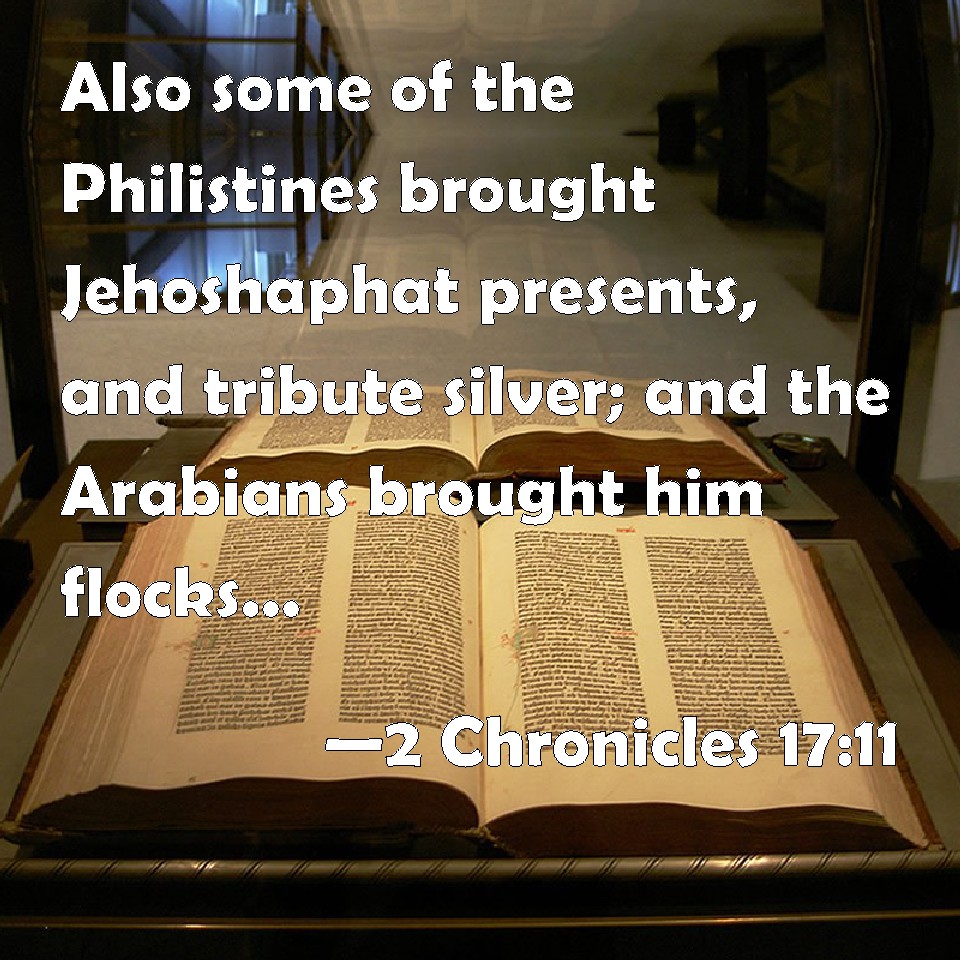 Choose a Background 2 Chronicles 17:11 Also some of the Philistines brought Jehoshaphat presents, and tribute silver; and the Arabians brought him flocks, seven thousand and seven hundred rams, and seven thousand and seven hundred he goats. KJV: Also some of the Philistines brought Jehoshaphat presents, and tribute silver; and the Arabians brought him flocks, seven thousand and seven hundred rams, and seven thousand and seven hundred he goats. DRB: The Philistines also brought presents to Josaphat, and tribute in silver, and the Arabians brought him cattle, seven thousand seven hundred rams, and as many he goats. DBT: And some of the Philistines brought Jehoshaphat gifts and tribute-silver. The Arabians also brought him flocks, seven thousand seven hundred rams, and seven thousand seven hundred he-goats. ERV: And some of the Philistines brought Jehoshaphat presents, and silver for tribute; the Arabians also brought him flocks, seven thousand and seven hundred rams, and seven thousand and seven hundred he-goats. WBT: Also some of the Philistines brought Jehoshaphat presents, and tribute silver; and the Arabians brought him flocks, seven thousand and seven hundred rams, and seven thousand and seven hundred he-goats. WEB: Some of the Philistines brought Jehoshaphat presents, and silver for tribute; the Arabians also brought him flocks, seven thousand and seven hundred rams, and seven thousand and seven hundred male goats. YLT: and of the Philistines they are bringing in to Jehoshaphat a present, and tribute silver; also, the Arabians are bringing to him a flock, rams seven thousand an seven hundred, and he-goats seven thousand and seven hundred.Links 2 Chronicles 17:11 NIV • 2 Chronicles 17:11 NLT • 2 Chronicles 17:11 ESV • 2 Chronicles 17:11 NASB • 2 Chronicles 17:11 KJV • 2 Chronicles 17:11 Interlinear • 2 Chronicles 17:11 Commentaries • 2 Chronicles 17:11 Parallel Texts • 2 Chronicles 17:11 Bible Apps • 2 Chronicles 17:11 Parallel • Bible Hub |