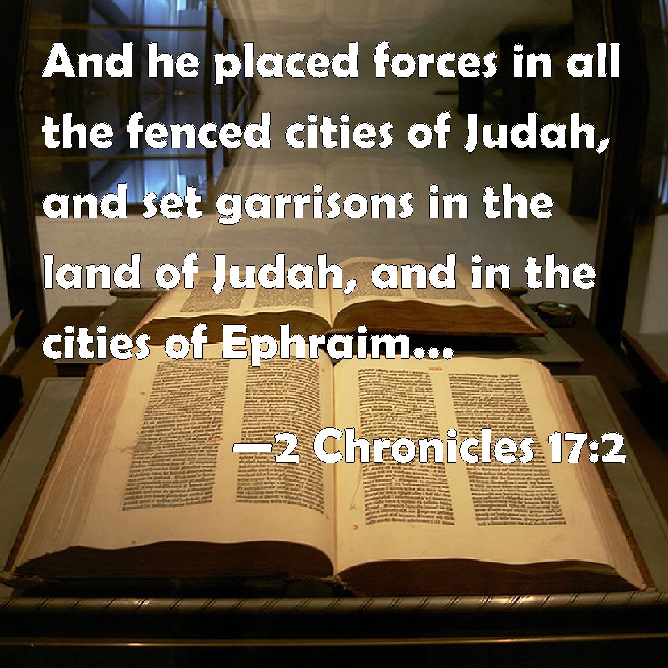 Choose a Background 2 Chronicles 17:2 And he placed forces in all the fenced cities of Judah, and set garrisons in the land of Judah, and in the cities of Ephraim, which Asa his father had taken. KJV: And he placed forces in all the fenced cities of Judah, and set garrisons in the land of Judah, and in the cities of Ephraim, which Asa his father had taken. DRB: And he placed numbers of soldiers in all the fortified cities of Juda. And he put garrisons in the land of Juda, and in the cities of Ephraim, which Asa his father had taken. DBT: And he placed forces in all the fortified cities of Judah, and set garrisons in the land of Judah, and in the cities of Ephraim that Asa his father had taken. ERV: And he placed forces in all the fenced cities of Judah, and set garrisons in the land of Judah, and in the cities of Ephraim, which Asa his father had taken. WBT: And he placed forces in all the fortified cities of Judah, and set garrisons in the land of Judah, and in the cities of Ephraim, which Asa his father had taken. WEB: He placed forces in all the fortified cities of Judah, and set garrisons in the land of Judah, and in the cities of Ephraim, which Asa his father had taken. YLT: and putteth a force in all the fenced cities of Judah, and putteth garrisons in the land of Judah, and in the cities of Ephraim that Asa his father had captured.Links 2 Chronicles 17:2 NIV • 2 Chronicles 17:2 NLT • 2 Chronicles 17:2 ESV • 2 Chronicles 17:2 NASB • 2 Chronicles 17:2 KJV • 2 Chronicles 17:2 Interlinear • 2 Chronicles 17:2 Commentaries • 2 Chronicles 17:2 Parallel Texts • 2 Chronicles 17:2 Bible Apps • 2 Chronicles 17:2 Parallel • Bible Hub |