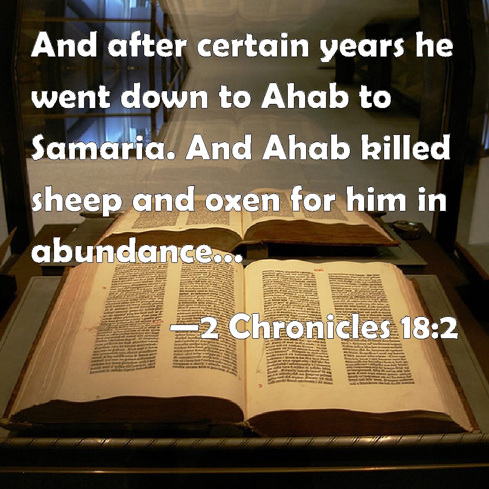 Choose a Background 2 Chronicles 18:2 And after certain years he went down to Ahab to Samaria. And Ahab killed sheep and oxen for him in abundance, and for the people that he had with him, and persuaded him to go up with him to Ramothgilead. KJV: And after certain years he went down to Ahab to Samaria. And Ahab killed sheep and oxen for him in abundance, and for the people that he had with him, and persuaded him to go up with him to Ramothgilead. DRB: And he went down to him after some years to Samaria: and Achab at his coming killed sheep and oxen in abundance for him and the people that came with him: and he persuaded him to go up to Ramoth Galaad. DBT: And after certain years he went down to Ahab, to Samaria. And Ahab killed sheep and oxen for him in abundance, and for the people that were with him, and urged him to go up against Ramoth-Gilead. ERV: And after certain years he went down to Ahab to Samaria. And Ahab killed sheep and oxen for him in abundance, and for the people that were with him, and moved him to go up with him to Ramoth-gilead. WBT: And after certain years he went down to Ahab to Samaria. And Ahab killed sheep and oxen for him in abundance, and for the people that he had with him, and persuaded him to go up with him to Ramoth-gilead. WEB: After certain years he went down to Ahab to Samaria. Ahab killed sheep and cattle for him in abundance, and for the people who were with him, and moved him to go up [with him] to Ramoth Gilead. YLT: and goeth down at the end of certain years unto Ahab to Samaria, and Ahab sacrificeth for him sheep and oxen in abundance, and for the people who are with him, and persuadeth him to go up unto Ramoth-Gilead.Links 2 Chronicles 18:2 NIV • 2 Chronicles 18:2 NLT • 2 Chronicles 18:2 ESV • 2 Chronicles 18:2 NASB • 2 Chronicles 18:2 KJV • 2 Chronicles 18:2 Interlinear • 2 Chronicles 18:2 Commentaries • 2 Chronicles 18:2 Parallel Texts • 2 Chronicles 18:2 Bible Apps • 2 Chronicles 18:2 Parallel • Bible Hub |