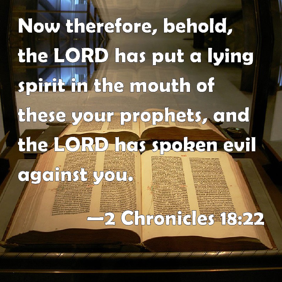 Choose a Background 2 Chronicles 18:22 Now therefore, behold, the LORD has put a lying spirit in the mouth of these your prophets, and the LORD has spoken evil against you. KJV: Now therefore, behold, the LORD hath put a lying spirit in the mouth of these thy prophets, and the LORD hath spoken evil against thee. DRB: Now therefore behold the Lord hath put a spirit of lying in the mouth of all thy prophets, and the Lord hath spoken evil against thee. DBT: And now, behold, Jehovah has put a lying spirit in the mouth of these thy prophets; and Jehovah has spoken evil concerning thee. ERV: Now therefore, behold, the LORD hath put a lying spirit in the mouth of these thy prophets; and the LORD hath spoken evil concerning thee. WBT: Now therefore, behold, the LORD hath put a lying spirit in the mouth of these thy prophets, and the LORD hath spoken evil against thee. WEB: "Now therefore, behold, Yahweh has put a lying spirit in the mouth of these your prophets; and Yahweh has spoken evil concerning you." YLT: And, now, lo, Jehovah hath put a spirit of falsehood in the mouth of these thy prophets, and Jehovah hath spoken concerning thee — evil.'Links 2 Chronicles 18:22 NIV • 2 Chronicles 18:22 NLT • 2 Chronicles 18:22 ESV • 2 Chronicles 18:22 NASB • 2 Chronicles 18:22 KJV • 2 Chronicles 18:22 Interlinear • 2 Chronicles 18:22 Commentaries • 2 Chronicles 18:22 Parallel Texts • 2 Chronicles 18:22 Bible Apps • 2 Chronicles 18:22 Parallel • Bible Hub |