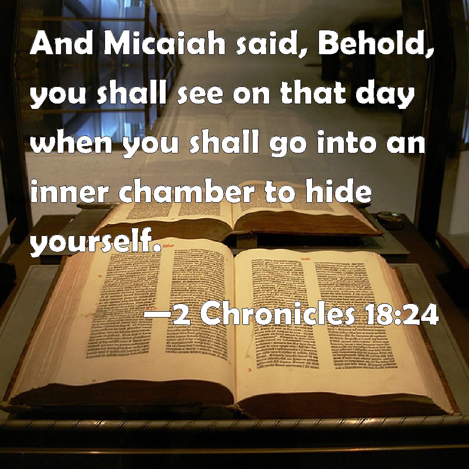 Choose a Background 2 Chronicles 18:24 And Micaiah said, Behold, you shall see on that day when you shall go into an inner chamber to hide yourself. KJV: And Micaiah said, Behold, thou shalt see on that day when thou shalt go into an inner chamber to hide thyself. DRB: And Micheas said :Thou thyself shalt see in that day, when thou shalt go in from chamber to chamber, to hide thyself. DBT: And Micah said, Behold, thou shalt see on that day when thou shalt go from chamber to chamber to hide thyself. ERV: And Micaiah said, Behold, thou shalt see on that day, when thou shalt go into an inner chamber to hide thyself. WBT: And Micaiah said, Behold, thou shalt see on that day when thou shalt go into an inner chamber to hide thyself. WEB: Micaiah said, "Behold, you shall see on that day, when you shall go into an inner room to hide yourself." YLT: And Micaiah saith, 'Lo, thou dost see in that day, that thou dost enter into the innermost chamber to be hidden.'Links 2 Chronicles 18:24 NIV • 2 Chronicles 18:24 NLT • 2 Chronicles 18:24 ESV • 2 Chronicles 18:24 NASB • 2 Chronicles 18:24 KJV • 2 Chronicles 18:24 Interlinear • 2 Chronicles 18:24 Commentaries • 2 Chronicles 18:24 Parallel Texts • 2 Chronicles 18:24 Bible Apps • 2 Chronicles 18:24 Parallel • Bible Hub |