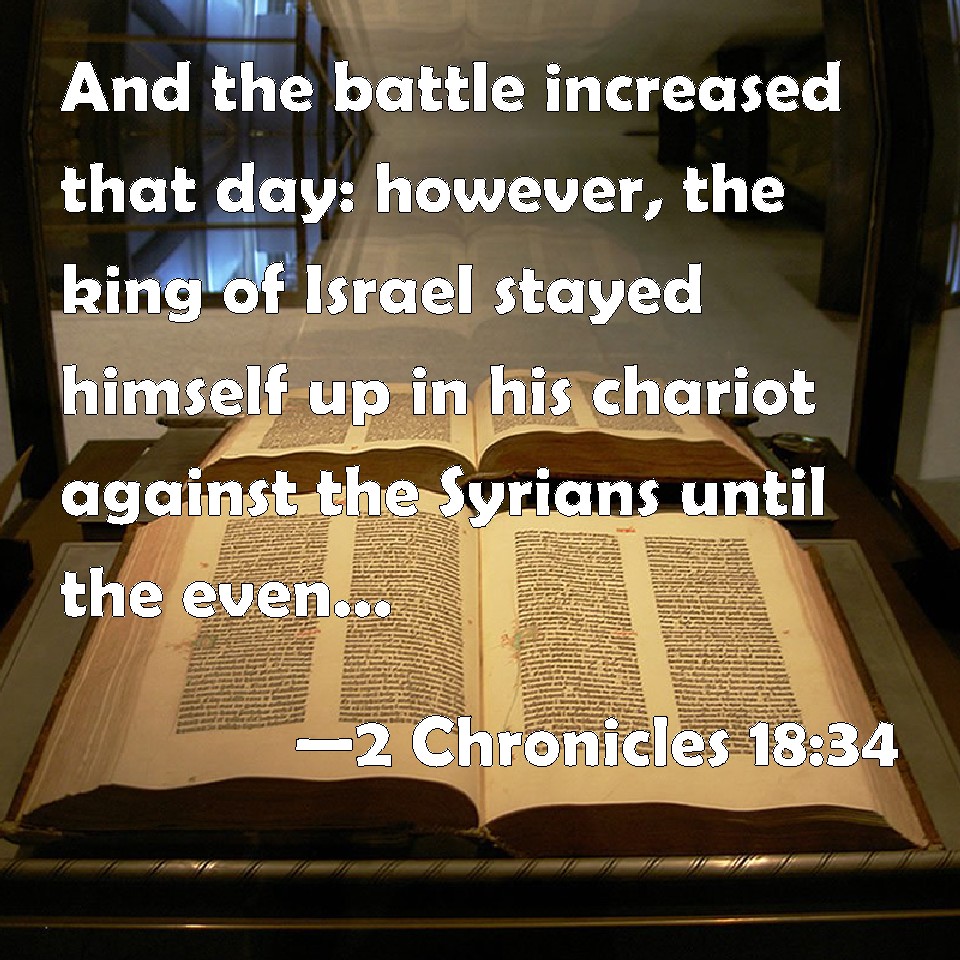 2 Chronicles 18:34 And the battle increased that day: however, the king of Israel stayed himself up in his chariot against the Syrians until the even: and about the time of the sun going down he died.