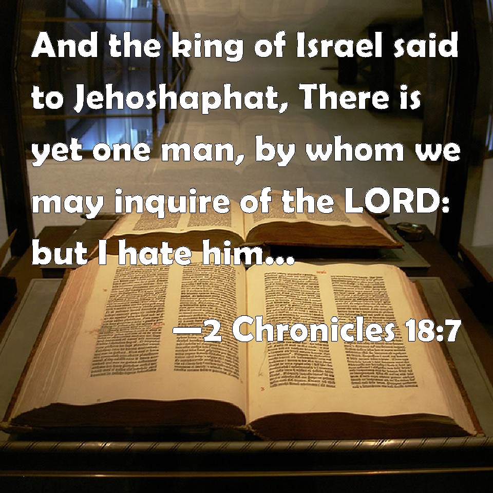 Choose a Background 2 Chronicles 18:7 And the king of Israel said to Jehoshaphat, There is yet one man, by whom we may inquire of the LORD: but I hate him; for he never prophesied good to me, but always evil: the same is Micaiah the son of Imla. And Jehoshaphat said, Let not the king say so. KJV: And the king of Israel said unto Jehoshaphat, There is yet one man, by whom we may inquire of the LORD: but I hate him; for he never prophesied good unto me, but always evil: the same is Micaiah the son of Imla. And Jehoshaphat said, Let not the king say so. DRB: And the king of Israel said to Josaphat: There is one man, of whom we may ask the will of the Lord: but I hate him, for he never prophesieth good to me, but always evil: and it is Micheas the son of Jemla. And Josaphat said: Speak not thus, O king. DBT: And the king of Israel said to Jehoshaphat, There is yet one man by whom we may inquire of Jehovah; but I hate him, for he prophesies no good concerning me, but always evil: it is Micah the son of Imlah. And Jehoshaphat said, Let not the king say so. ERV: And the king of Israel said unto Jehoshaphat, There is yet one man by whom we may inquire of the LORD: but I hate him; for he never prophesieth good concerning me, but always evil: the same is Micaiah the son of Imla. And Jehoshaphat said, Let not the king say so. WBT: And the king of Israel said to Jehoshaphat, There is yet one man, by whom we may inquire of the LORD: but I hate him; for he never prophesieth good to me, but always evil: the same is Micaiah the son of Imla. And Jehoshaphat said, Let not the king say so. WEB: The king of Israel said to Jehoshaphat, "There is yet one man by whom we may inquire of Yahweh; but I hate him, for he never prophesies good concerning me, but always evil. He is Micaiah the son of Imla." Jehoshaphat said, "Don't let the king say so." YLT: And the king of Israel saith unto Jehoshaphat, 'Still — one man to seek Jehovah from him, and I — I have hated him, for he is not prophesying concerning me of good, but all his days of evil, he is Micaiah son of Imlah;' and Jehoshaphat saith, 'Let not the king say so.'Links 2 Chronicles 18:7 NIV • 2 Chronicles 18:7 NLT • 2 Chronicles 18:7 ESV • 2 Chronicles 18:7 NASB • 2 Chronicles 18:7 KJV • 2 Chronicles 18:7 Interlinear • 2 Chronicles 18:7 Commentaries • 2 Chronicles 18:7 Parallel Texts • 2 Chronicles 18:7 Bible Apps • 2 Chronicles 18:7 Parallel • Bible Hub |