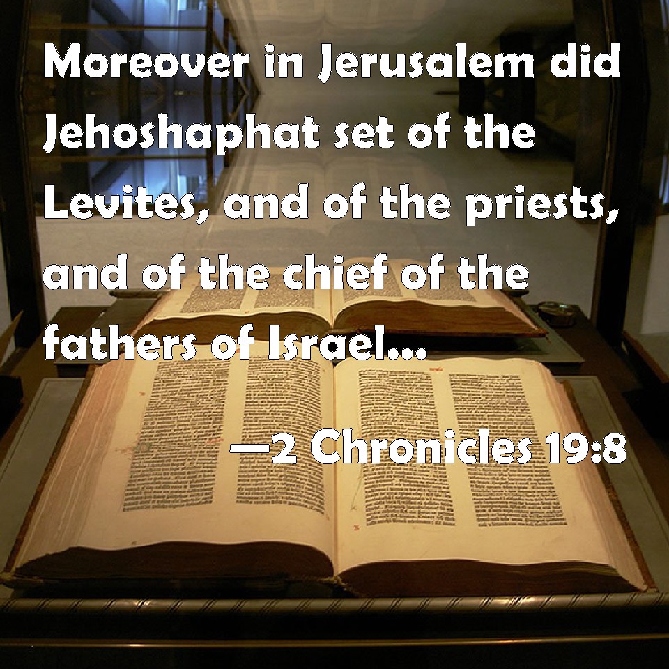 Choose a Background 2 Chronicles 19:8 Moreover in Jerusalem did Jehoshaphat set of the Levites, and of the priests, and of the chief of the fathers of Israel, for the judgment of the LORD, and for controversies, when they returned to Jerusalem. KJV: Moreover in Jerusalem did Jehoshaphat set of the Levites, and of the priests, and of the chief of the fathers of Israel, for the judgment of the LORD, and for controversies, when they returned to Jerusalem. DRB: In Jerusalem also Josaphat appointed Levites, and priests and chiefs of the families of Israel, to judge the judgment and the cause of the Lord for the inhabitants thereof. DBT: And moreover in Jerusalem did Jehoshaphat set some of the Levites And priests, And of the chief fathers of Israel, for the judgment of Jehovah And for causes. And they returned to Jerusalem. ERV: Moreover in Jerusalem did Jehoshaphat set of the Levites and the priests, and of the heads of the fathers' houses of Israel, for the judgment of the LORD, and for controversies. And they returned to Jerusalem. WBT: Moreover, in Jerusalem did Jehoshaphat set of the Levites, and of the priests, and of the chief of the fathers of Israel, for the judgment of the LORD, and for controversies, when they returned to Jerusalem. WEB: Moreover in Jerusalem Jehoshaphat appointed Levites and priests, and of the heads of the fathers' [houses] of Israel, for the judgment of Yahweh, and for controversies. They returned to Jerusalem. YLT: And also in Jerusalem hath Jehoshaphat appointed of the Levites, and of the priests, and of the heads of the fathers of Israel, for the judgment of Jehovah, and for strife; and they turn back to Jerusalem,Links 2 Chronicles 19:8 NIV • 2 Chronicles 19:8 NLT • 2 Chronicles 19:8 ESV • 2 Chronicles 19:8 NASB • 2 Chronicles 19:8 KJV • 2 Chronicles 19:8 Interlinear • 2 Chronicles 19:8 Commentaries • 2 Chronicles 19:8 Parallel Texts • 2 Chronicles 19:8 Bible Apps • 2 Chronicles 19:8 Parallel • Bible Hub |
