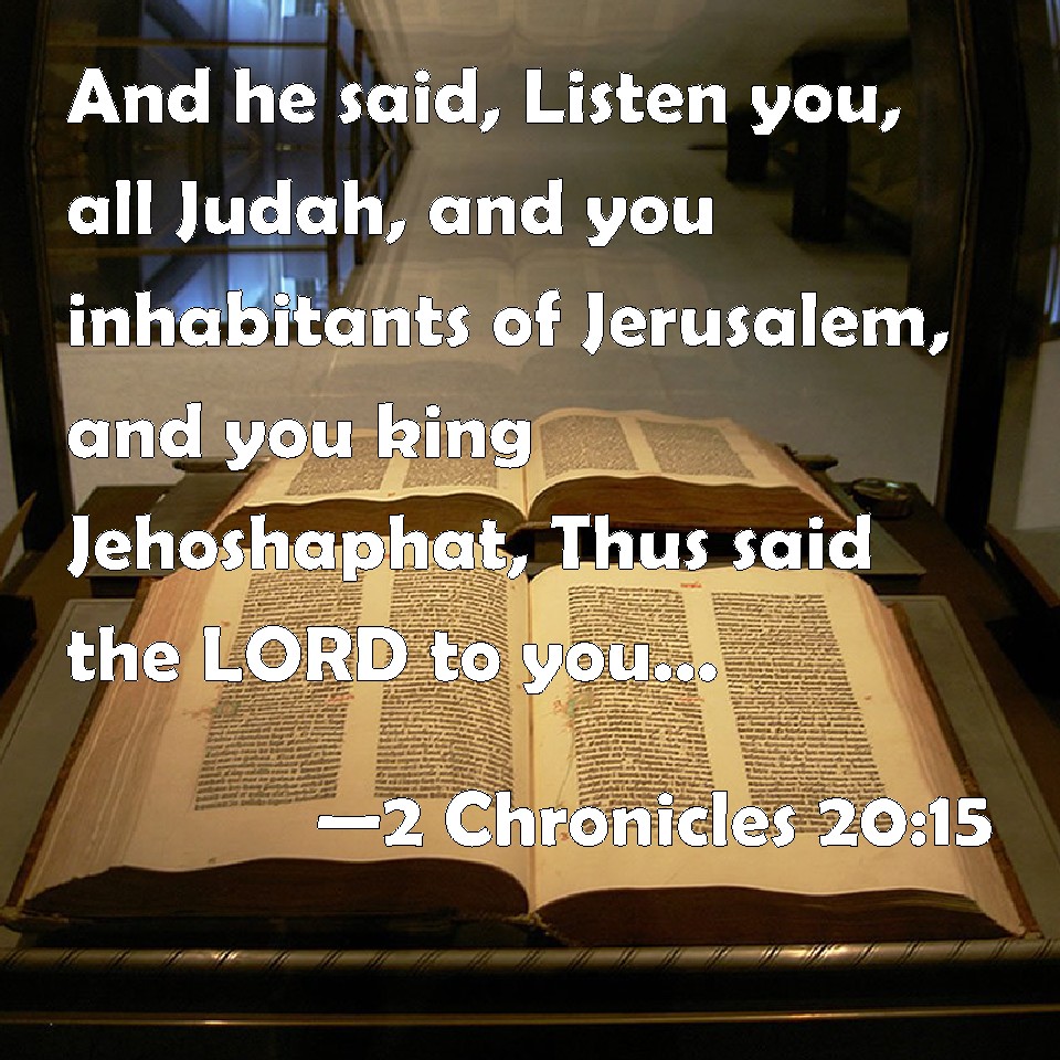 Choose a Background 2 Chronicles 20:15 And he said, Listen you, all Judah, and you inhabitants of Jerusalem, and you king Jehoshaphat, Thus said the LORD to you, Be not afraid nor dismayed by reason of this great multitude; for the battle is not yours, but God's. KJV: And he said, Hearken ye, all Judah, and ye inhabitants of Jerusalem, and thou king Jehoshaphat, Thus saith the LORD unto you, Be not afraid nor dismayed by reason of this great multitude; for the battle is not yours, but God's. DRB: And he said: Attend ye, all Juda, and you that dwell in Jerusalem, and thou king Josaphat: Thus saith the Lord to you: Fear ye not, and be not dismayed at this multitude: for the battle is not yours, but God's. DBT: and he said, Be attentive, all Judah, and ye inhabitants of Jerusalem, and thou king Jehoshaphat! Thus saith Jehovah unto you: Fear not, nor be dismayed by reason of this great multitude; for the battle is not yours, but God's. ERV: and he said, Hearken ye, all Judah, and ye inhabitants of Jerusalem, and thou king Jehoshaphat: thus saith the LORD unto you, Fear not ye, neither be dismayed by reason of this great multitude; for the battle is not yours, but God's. WBT: And he said, Hearken ye, all Judah, and ye inhabitants of Jerusalem, and thou king Jehoshaphat, Thus saith the LORD to you, Be not afraid nor dismayed by reason of this great multitude; for the battle is not yours, but God's. WEB: and he said, "Listen, all Judah, and you inhabitants of Jerusalem, and you king Jehoshaphat. Thus says Yahweh to you, 'Don't be afraid, neither be dismayed by reason of this great multitude; for the battle is not yours, but God's. YLT: and he saith, 'Attend, all Judah, and ye inhabitants of Jerusalem, and O king Jehoshaphat, Thus said Jehovah to you, Ye fear not, nor are afraid of the face of this great multitude, for not for you is the battle, but for God.Links 2 Chronicles 20:15 NIV • 2 Chronicles 20:15 NLT • 2 Chronicles 20:15 ESV • 2 Chronicles 20:15 NASB • 2 Chronicles 20:15 KJV • 2 Chronicles 20:15 Interlinear • 2 Chronicles 20:15 Commentaries • 2 Chronicles 20:15 Parallel Texts • 2 Chronicles 20:15 Bible Apps • 2 Chronicles 20:15 Parallel • Bible Hub |