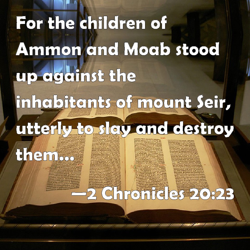 Choose a Background 2 Chronicles 20:23 For the children of Ammon and Moab stood up against the inhabitants of mount Seir, utterly to slay and destroy them: and when they had made an end of the inhabitants of Seir, every one helped to destroy another. KJV: For the children of Ammon and Moab stood up against the inhabitants of mount Seir, utterly to slay and destroy them: and when they had made an end of the inhabitants of Seir, every one helped to destroy another. DRB: For the children of Ammon, and of Moab, rose up against the inhabitants of mount Seir, to kill and destroy them: and when they had made an end of them, they turned also against one another, and destroyed one another. DBT: And the children of Ammon and Moab stood up against the inhabitants of mount Seir, to exterminate and destroy them; and when they had made an end of the inhabitants of Seir, they helped to destroy one another. ERV: For the children of Ammon and Moab stood up against the inhabitants of mount Seir, utterly to slay and destroy them: and when they had made an end of the inhabitants of Seir, every one helped to destroy another. WBT: For the children of Ammon and Moab stood up against the inhabitants of mount Seir, utterly to slay and destroy them: and when they had made an end of the inhabitants of Seir, every one helped to destroy another. WEB: For the children of Ammon and Moab stood up against the inhabitants of Mount Seir, utterly to kill and destroy them: and when they had made an end of the inhabitants of Seir, everyone helped to destroy another. YLT: and the sons of Ammon stand up, and Moab, against the inhabitants of mount Seir, to devote and to destroy, and at their finishing with the inhabitants of Seir, they helped, a man against his neighbour, to destroy.Links 2 Chronicles 20:23 NIV • 2 Chronicles 20:23 NLT • 2 Chronicles 20:23 ESV • 2 Chronicles 20:23 NASB • 2 Chronicles 20:23 KJV • 2 Chronicles 20:23 Interlinear • 2 Chronicles 20:23 Commentaries • 2 Chronicles 20:23 Parallel Texts • 2 Chronicles 20:23 Bible Apps • 2 Chronicles 20:23 Parallel • Bible Hub |