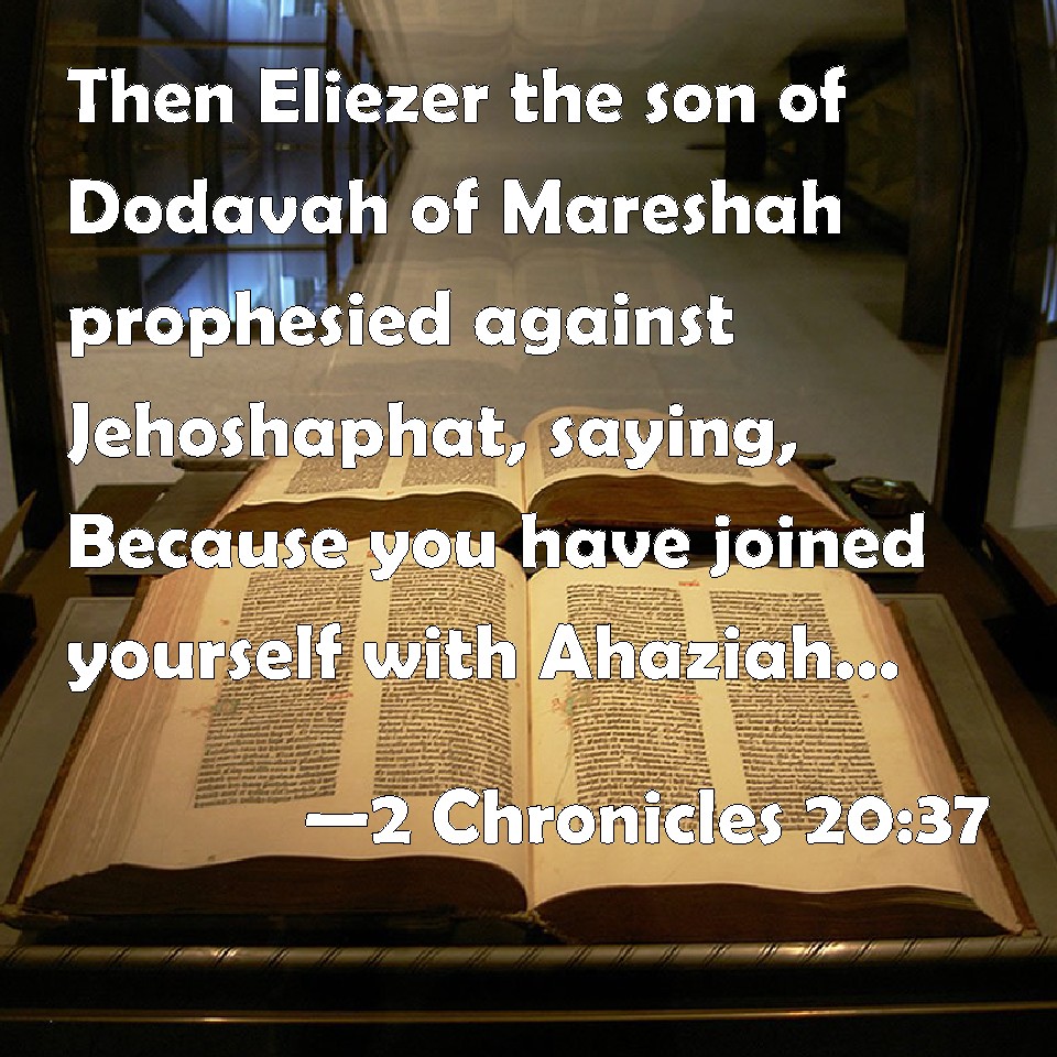 Choose a Background 2 Chronicles 20:37 Then Eliezer the son of Dodavah of Mareshah prophesied against Jehoshaphat, saying, Because you have joined yourself with Ahaziah, the LORD has broken your works. And the ships were broken, that they were not able to go to Tarshish. KJV: Then Eliezer the son of Dodavah of Mareshah prophesied against Jehoshaphat, saying, Because thou hast joined thyself with Ahaziah, the LORD hath broken thy works. And the ships were broken, that they were not able to go to Tarshish. DRB: And Eliezer the son of Dodau of Maresa prophesied to Josaphat, saying: Because thou hast made a league with Ochozias, the Lord hath destroyed thy works, and the ships are broken, and they could not go to Tharsis. DBT: And Eliezer the son of Dodavah, of Mareshah, prophesied against Jehoshaphat, saying, Because thou hast joined thyself with Ahaziah, Jehovah has broken thy works. And the ships were broken, and could not go to Tarshish. ERV: Then Eliezer the son of Dodavahu of Mareshah prophesied against Jehoshaphat, saying, Because thou hast joined thyself with Ahaziah, the LORD hath destroyed thy works. And the ships were broken, that they were not able to go to Tarshish. WBT: Then Eliezer the son of Dodavah of Mareshah prophesied against Jehoshaphat, saying, Because thou hast joined thyself with Ahaziah, the LORD hath broken thy works. And the ships were broken, that they were not able to go to Tarshish. WEB: Then Eliezer the son of Dodavahu of Mareshah prophesied against Jehoshaphat, saying, "Because you have joined yourself with Ahaziah, Yahweh has destroyed your works." The ships were broken, so that they were not able to go to Tarshish. YLT: and prophesy doth Eliezer son of Dodavah, of Mareshah, against Jehoshaphat, saying, 'For thy joining thyself with Ahaziah, Jehovah hath broken up thy works;' and the ships are broken, and have not retained power to go unto Tarshish.Links 2 Chronicles 20:37 NIV • 2 Chronicles 20:37 NLT • 2 Chronicles 20:37 ESV • 2 Chronicles 20:37 NASB • 2 Chronicles 20:37 KJV • 2 Chronicles 20:37 Interlinear • 2 Chronicles 20:37 Commentaries • 2 Chronicles 20:37 Parallel Texts • 2 Chronicles 20:37 Bible Apps • 2 Chronicles 20:37 Parallel • Bible Hub |