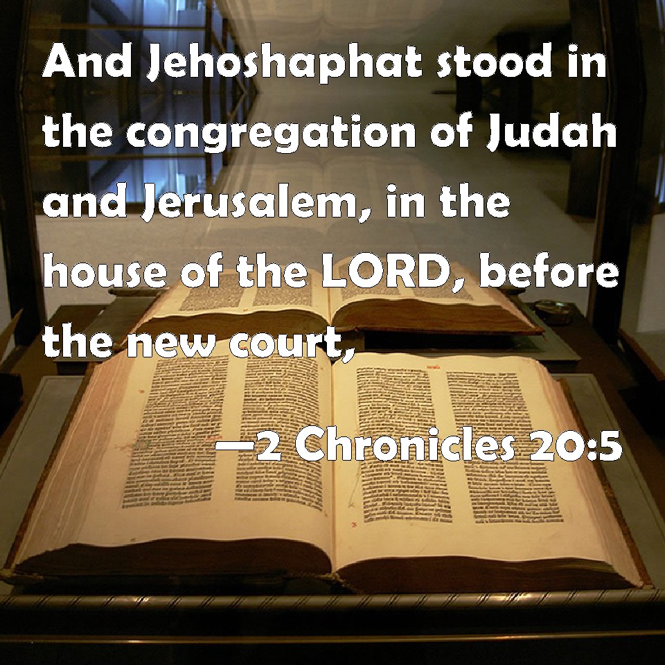 Choose a Background 2 Chronicles 20:5 And Jehoshaphat stood in the congregation of Judah and Jerusalem, in the house of the LORD, before the new court, KJV: And Jehoshaphat stood in the congregation of Judah and Jerusalem, in the house of the LORD, before the new court, DRB: And Josaphat stood in the midst of the assembly of Juda, and Jerusalem, in the house of the Lord before the new court, DBT: And Jehoshaphat stood in the congregation of Judah and Jerusalem, in the house of Jehovah, before the new court; ERV: And Jehoshaphat stood in the congregation of Judah and Jerusalem, in the house of the LORD, before the new court; WBT: And Jehoshaphat stood in the congregation of Judah and Jerusalem, in the house of the LORD, before the new court, WEB: Jehoshaphat stood in the assembly of Judah and Jerusalem, in the house of Yahweh, before the new court; YLT: And Jehoshaphat standeth in the assembly of Judah and Jerusalem, in the house of Jehovah, at the front of the new court,Links 2 Chronicles 20:5 NIV • 2 Chronicles 20:5 NLT • 2 Chronicles 20:5 ESV • 2 Chronicles 20:5 NASB • 2 Chronicles 20:5 KJV • 2 Chronicles 20:5 Interlinear • 2 Chronicles 20:5 Commentaries • 2 Chronicles 20:5 Parallel Texts • 2 Chronicles 20:5 Bible Apps • 2 Chronicles 20:5 Parallel • Bible Hub |