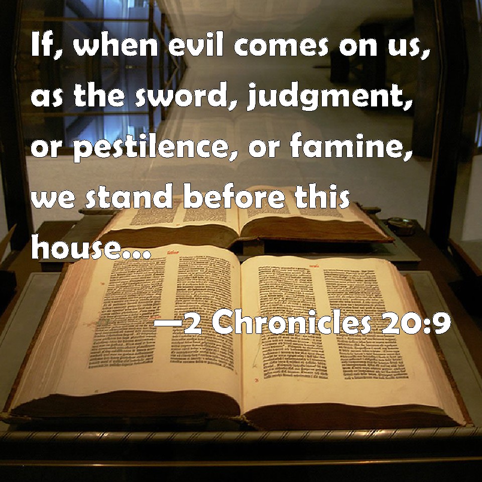 Choose a Background 2 Chronicles 20:9 If, when evil comes on us, as the sword, judgment, or pestilence, or famine, we stand before this house, and in your presence, (for your name is in this house,) and cry to you in our affliction, then you will hear and help. KJV: If, when evil cometh upon us, as the sword, judgment, or pestilence, or famine, we stand before this house, and in thy presence, (for thy name is in this house,) and cry unto thee in our affliction, then thou wilt hear and help. DRB: If evils fall upon us, the sword of judgment, or pestilence, or famine, we will stand in thy presence before this house, in which thy name is called upon: and we will cry to thee in our afflictions, and thou wilt hear, and save us. DBT: If evil come upon us, sword, judgment, or pestilence, or famine, and we stand before this house and before thee for thy name is in this house and cry unto thee in our distress, then thou wilt hear and save. ERV: If evil come upon us, the sword, judgment, or pestilence, or famine, we will stand before this house, and before thee, (for thy name is in this house,) and cry unto thee in our affliction, and thou wilt hear and save. WBT: If, when evil cometh upon us, as the sword, judgment, or pestilence, or famine, we stand before this house, and in thy presence, (for thy name is in this house,) and cry to thee in our affliction, then thou wilt hear and help. WEB: If evil comes on us—the sword, judgment, pestilence, or famine—we will stand before this house, and before you, (for your name is in this house), and cry to you in our affliction, and you will hear and save.' YLT: If evil doth come upon us — sword, judgment, and pestilence, and famine — we stand before this house, and before Thee, for Thy name is in this house, and cry unto Thee out of our distress, and Thou dost hear and save.Links 2 Chronicles 20:9 NIV • 2 Chronicles 20:9 NLT • 2 Chronicles 20:9 ESV • 2 Chronicles 20:9 NASB • 2 Chronicles 20:9 KJV • 2 Chronicles 20:9 Interlinear • 2 Chronicles 20:9 Commentaries • 2 Chronicles 20:9 Parallel Texts • 2 Chronicles 20:9 Bible Apps • 2 Chronicles 20:9 Parallel • Bible Hub |