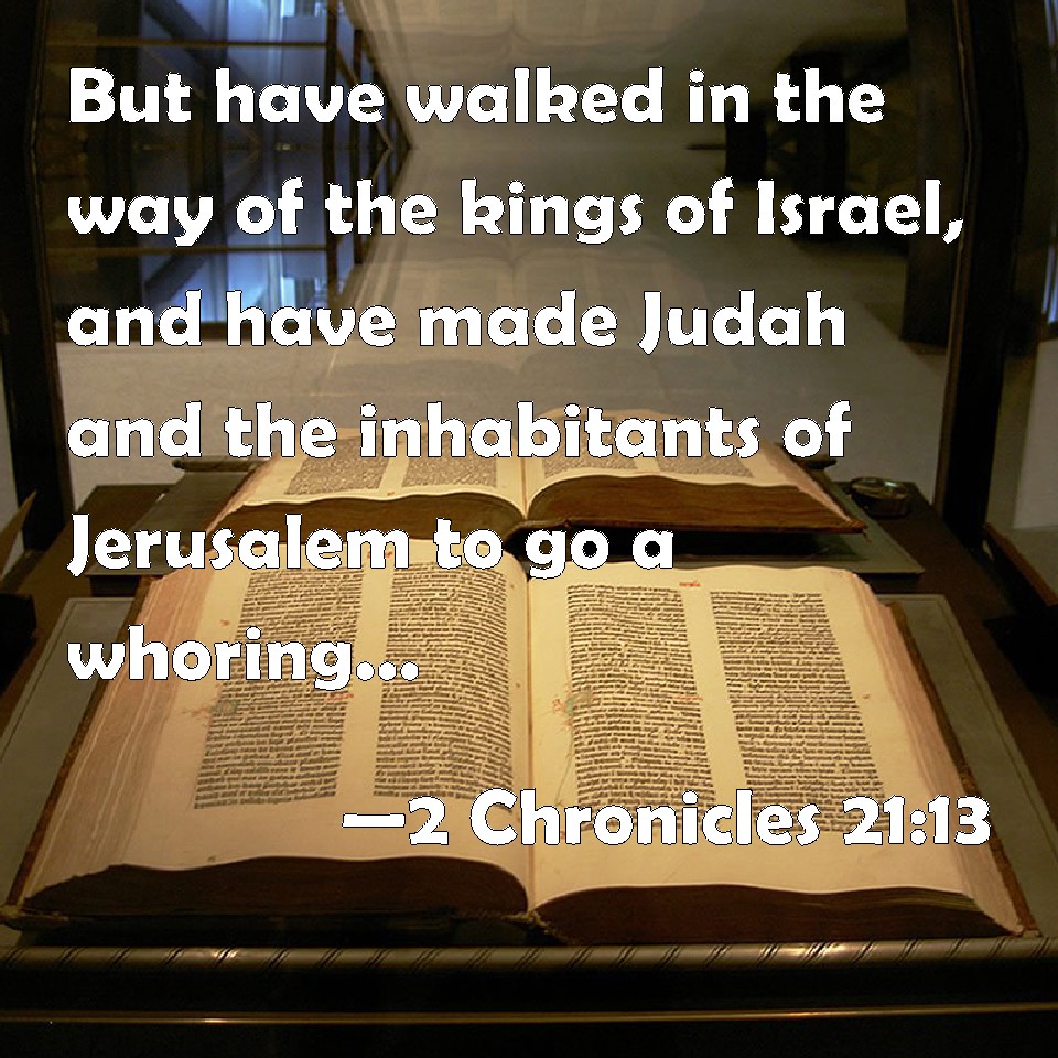 Choose a Background 2 Chronicles 21:13 But have walked in the way of the kings of Israel, and have made Judah and the inhabitants of Jerusalem to go a whoring, like to the prostitutions of the house of Ahab, and also have slain your brothers of your father's house, which were better than yourself: KJV: But hast walked in the way of the kings of Israel, and hast made Judah and the inhabitants of Jerusalem to go a whoring, like to the whoredoms of the house of Ahab, and also hast slain thy brethren of thy father's house, which were better than thyself: DRB: But hast walked in the ways of the kings of Israel, and hast made Juda and the inhabitants of Jerusalem to commit fornication, imitating the fornication of the house of Achab, moreover also thou hast killed thy brethren, the house of thy father, better men than thyself, DBT: but hast walked in the way of the kings of Israel, and hast made Judah and the inhabitants of Jerusalem to commit fornication, like the fornications of the house of Ahab, and also hast slain thy brethren, thy father's house who were better than thyself: ERV: but hast walked in the way of the kings of Israel, and hast made Judah and the inhabitants of Jerusalem to go a whoring, like as the house of Ahab did; and also hast slain thy brethren of thy father's house, which were better than thyself: WBT: But hast walked in the way of the kings of Israel, and hast made Judah and the inhabitants of Jerusalem to commit idolatry, like the idolatries of the house of Ahab, and also hast slain thy brethren of thy father's house, who were better than thyself: WEB: but have walked in the way of the kings of Israel, and have made Judah and the inhabitants of Jerusalem to play the prostitute, like the house of Ahab did, and also have slain your brothers of your father's house, who were better than yourself: YLT: and thou dost walk in the way of the kings of Israel, and dost cause Judah and the inhabitants of Jerusalem to commit whoredom like the whoredoms of the house of Ahab, and also thy brethren, the house of thy father, who are better than thyself, thou hast slain;Links 2 Chronicles 21:13 NIV • 2 Chronicles 21:13 NLT • 2 Chronicles 21:13 ESV • 2 Chronicles 21:13 NASB • 2 Chronicles 21:13 KJV • 2 Chronicles 21:13 Interlinear • 2 Chronicles 21:13 Commentaries • 2 Chronicles 21:13 Parallel Texts • 2 Chronicles 21:13 Bible Apps • 2 Chronicles 21:13 Parallel • Bible Hub |
