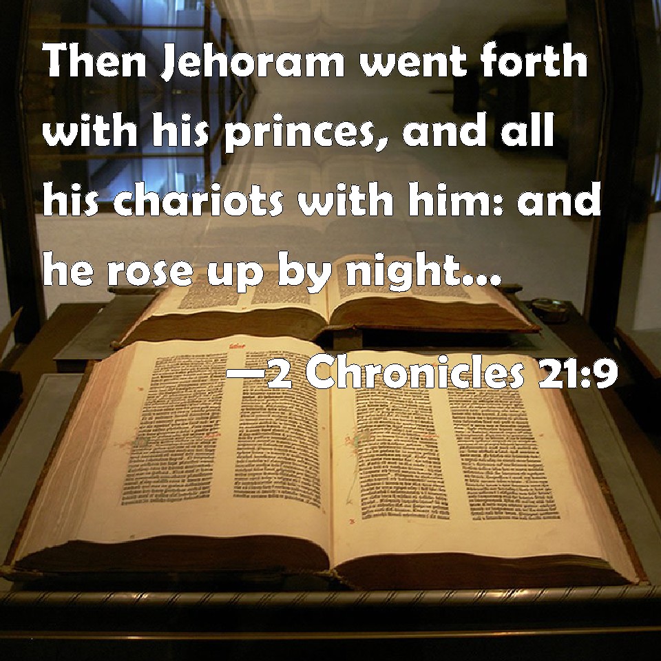 Choose a Background 2 Chronicles 21:9 Then Jehoram went forth with his princes, and all his chariots with him: and he rose up by night, and smote the Edomites which compassed him in, and the captains of the chariots. KJV: Then Jehoram went forth with his princes, and all his chariots with him: and he rose up by night, and smote the Edomites which compassed him in, and the captains of the chariots. DRB: And Joram went over with his princes, and all his cavalry with him, and rose in the night, and defeated the Edomites who had surrounded him, and all the captains of his cavalry. DBT: And Jehoram went over with his captains, and all the chariots with him; and he rose up by night, and smote the Edomites who had surrounded him, and the captains of the chariots. ERV: Then Jehoram passed over with his captains, and all his chariots with him: and he rose up by night, and smote the Edomites which compassed him about, and the captains of the chariots. WBT: Then Jehoram went forth with his princes, and all his chariots with him: and he rose by night, and smote the Edomites who encompassed him, and the captains of the chariots. WEB: Then Jehoram passed over with his captains, and all his chariots with him: and he rose up by night, and struck the Edomites who surrounded him, along with the captains of the chariots. YLT: and Jehoram passeth over with his heads, and all the chariots with him, and it cometh to pass, he hath risen by night and smiteth the Edomites who are coming round against him, and the princes of the chariots,Links 2 Chronicles 21:9 NIV • 2 Chronicles 21:9 NLT • 2 Chronicles 21:9 ESV • 2 Chronicles 21:9 NASB • 2 Chronicles 21:9 KJV • 2 Chronicles 21:9 Interlinear • 2 Chronicles 21:9 Commentaries • 2 Chronicles 21:9 Parallel Texts • 2 Chronicles 21:9 Bible Apps • 2 Chronicles 21:9 Parallel • Bible Hub |
