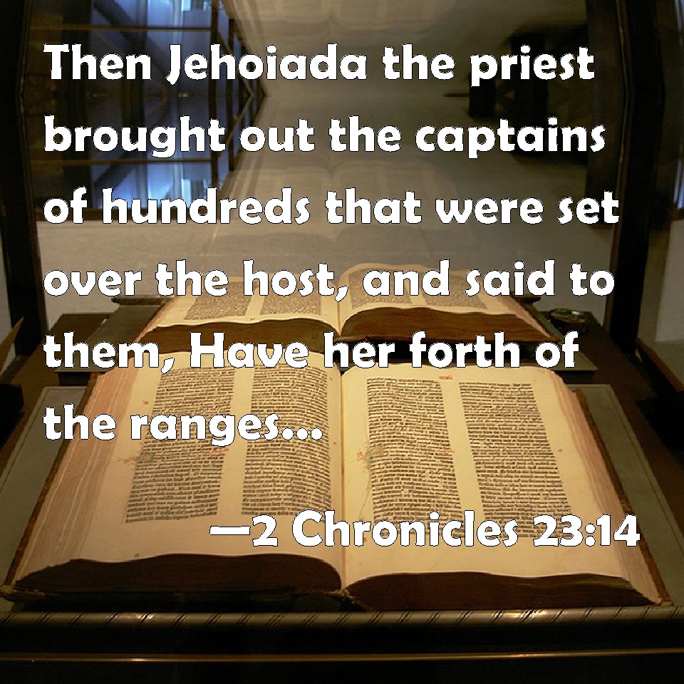 Choose a Background 2 Chronicles 23:14 Then Jehoiada the priest brought out the captains of hundreds that were set over the host, and said to them, Have her forth of the ranges: and whoever follows her, let him be slain with the sword. For the priest said, Slay her not in the house of the LORD. KJV: Then Jehoiada the priest brought out the captains of hundreds that were set over the host, and said unto them, Have her forth of the ranges: and whoso followeth her, let him be slain with the sword. For the priest said, Slay her not in the house of the LORD. DRB: And Joiada the high priest going out to the captains, and the chiefs of the army, said to them: Take her forth without the precinct of the temple, and when she is without let her be killed with the sword. For the priest commanded that she should not be killed in the house of the Lord. DBT: And Jehoiada the priest brought out the captains of the hundreds that were set over the host, and said to them, Lead her forth without the ranks; and whosoever follows her, let him be slain with the sword; for the priest said, Ye shall not put her to death in the house of Jehovah. ERV: And Jehoiada the priest brought out the captains of hundreds that were set over the host, and said unto them, Have her forth between the ranks; and whoso followeth her, let him be slain with the sword: for the priest said, Slay her not in the house of the LORD. WBT: Then Jehoiada the priest brought out the captains of hundreds that were set over the host, and said to them, Have her forth without the ranges: and whoever followeth her, let him be slain with the sword. For the priest said, Slay her not in the house of the LORD. WEB: Jehoiada the priest brought out the captains of hundreds who were set over the army, and said to them, "Bring her out between the ranks; and whoever follows her, let him be slain with the sword." For the priest said, "Don't kill her in the Yahweh's house." YLT: And Jehoiada the priest bringeth out the heads of the hundreds, inspectors of the force, and saith unto them, 'Take her out from within the rows, and he who hath gone after her is put to death by the sword;' for the priest said, 'Put her not to death in the house of Jehovah.'Links 2 Chronicles 23:14 NIV • 2 Chronicles 23:14 NLT • 2 Chronicles 23:14 ESV • 2 Chronicles 23:14 NASB • 2 Chronicles 23:14 KJV • 2 Chronicles 23:14 Interlinear • 2 Chronicles 23:14 Commentaries • 2 Chronicles 23:14 Parallel Texts • 2 Chronicles 23:14 Bible Apps • 2 Chronicles 23:14 Parallel • Bible Hub |