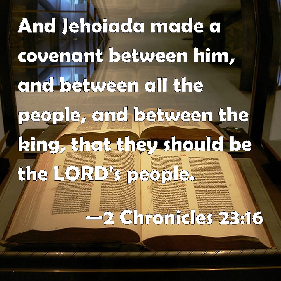 Choose a Background 2 Chronicles 23:16 And Jehoiada made a covenant between him, and between all the people, and between the king, that they should be the LORD's people. KJV: And Jehoiada made a covenant between him, and between all the people, and between the king, that they should be the LORD'S people. DRB: And Joiada made a covenant between himself and all the people, and the king, that they should be the people of the Lord. DBT: And Jehoiada made a covenant between himself and all the people and the king, that they should be the people of Jehovah. ERV: And Jehoiada made a covenant between himself, and all the people, and the king, that they should be the LORD'S people. WBT: And Jehoiada made a covenant between him, and between all the people, and between the king, that they should be the LORD'S people. WEB: Jehoiada made a covenant between himself, and all the people, and the king, that they should be Yahweh's people. YLT: And Jehoiada maketh a covenant between him, and between all the people, and between the king, to be for a people to Jehovah;Links 2 Chronicles 23:16 NIV • 2 Chronicles 23:16 NLT • 2 Chronicles 23:16 ESV • 2 Chronicles 23:16 NASB • 2 Chronicles 23:16 KJV • 2 Chronicles 23:16 Interlinear • 2 Chronicles 23:16 Commentaries • 2 Chronicles 23:16 Parallel Texts • 2 Chronicles 23:16 Bible Apps • 2 Chronicles 23:16 Parallel • Bible Hub |