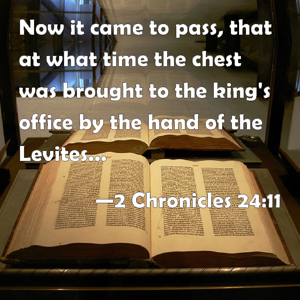 Choose a Background 2 Chronicles 24:11 Now it came to pass, that at what time the chest was brought to the king's office by the hand of the Levites, and when they saw that there was much money, the king's scribe and the high priest's officer came and emptied the chest, and took it, and carried it to his place again. Thus they did day by day, and gathered money in abundance. KJV: Now it came to pass, that at what time the chest was brought unto the king's office by the hand of the Levites, and when they saw that there was much money, the king's scribe and the high priest's officer came and emptied the chest, and took it, and carried it to his place again. Thus they did day by day, and gathered money in abundance. DRB: And when it was time to bring the chest before the king by the hands of the Levites, (for they saw there was much money,) the king's scribe, and he whom the high priest had appointed went in: and they poured out the money that was in the chest: and they carried back the chest to its place: and thus they did from day to day, and there was gathered an immense sum of money. DBT: And it came to pass at the time the chest was brought for the king's control by the hand of the Levites, and when they saw that there was much money, the king's scribe and high priest's officer came, and they emptied the chest, and took it, and carried it to its place again. Thus they did day by day, and gathered money in abundance. ERV: And it was so, that at what time the chest was brought unto the king's office by the hand of the Levites, and when they saw that there was much money, the king's scribe and the chief priest's officer came and emptied the chest, and took it, and carried it to its place again. Thus they did day by day, and gathered money in abundance. WBT: Now it came to pass, that at the time the chest was brought to the king's office by the hand of the Levites, and when they saw that there was much money, the king's scribe and the high priest's officer came and emptied the chest, and took it, and carried it to its place again. Thus they did day by day, and collected money in abundance. WEB: It was so, that whenever the chest was brought to the king's officers by the hand of the Levites, and when they saw that there was much money, the king's scribe and the chief priest's officer came and emptied the chest, and took it, and carried it to its place again. Thus they did day by day, and gathered money in abundance. YLT: And it cometh to pass, at the time one bringeth in the chest for the inspection of the king by the hand of the Levites, and at their seeing that the money is abundant, that a scribe of the king hath come in, and an officer of the head-priest, and they empty the chest, and take it up and turn it back unto its place; thus they have done day by day, and gather money in abundance.Links 2 Chronicles 24:11 NIV • 2 Chronicles 24:11 NLT • 2 Chronicles 24:11 ESV • 2 Chronicles 24:11 NASB • 2 Chronicles 24:11 KJV • 2 Chronicles 24:11 Interlinear • 2 Chronicles 24:11 Commentaries • 2 Chronicles 24:11 Parallel Texts • 2 Chronicles 24:11 Bible Apps • 2 Chronicles 24:11 Parallel • Bible Hub |