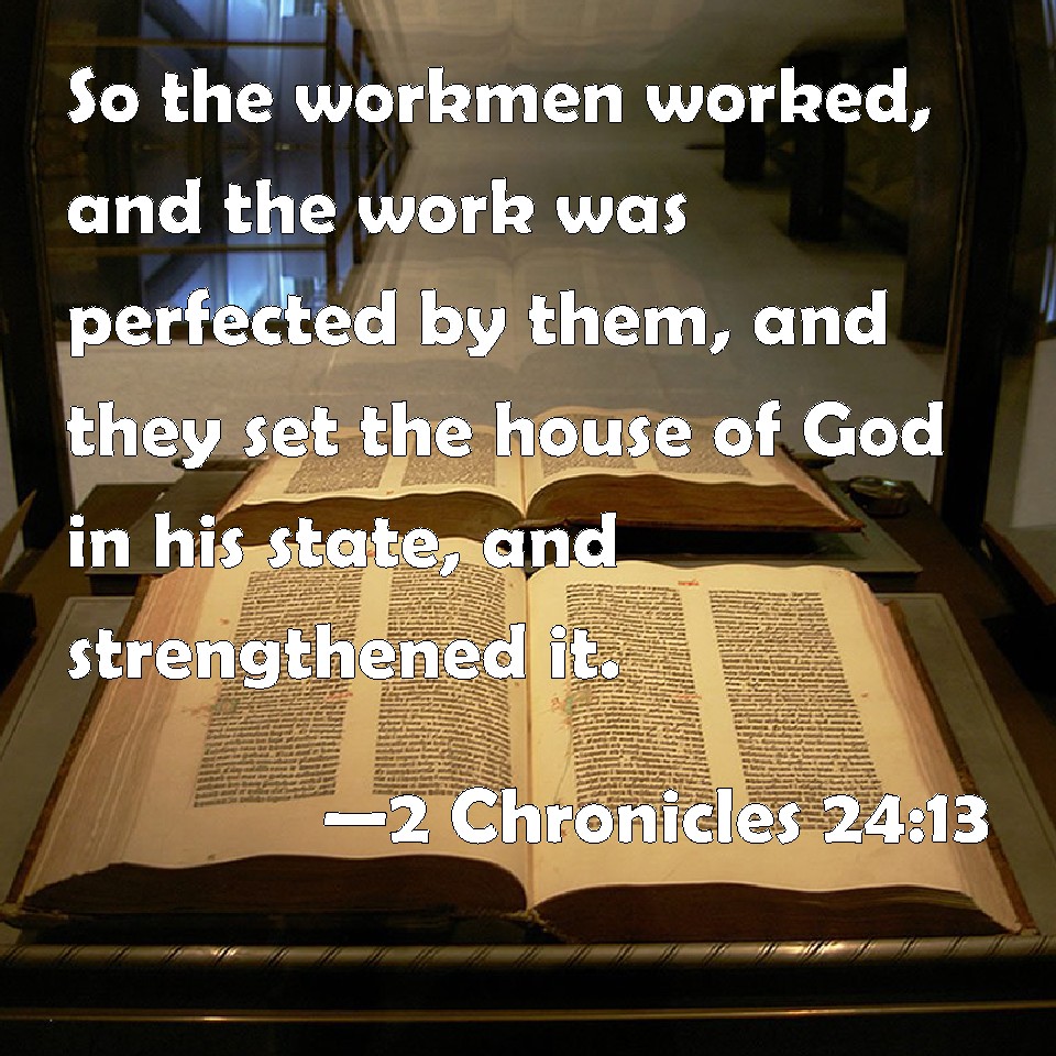 Choose a Background 2 Chronicles 24:13 So the workmen worked, and the work was perfected by them, and they set the house of God in his state, and strengthened it. KJV: So the workmen wrought, and the work was perfected by them, and they set the house of God in his state, and strengthened it. DRB: And the workmen were diligent, and the breach of the walls was closed up by their hands, and they set up the house of the Lord in its former state, and made it stand firm. DBT: So the workmen wrought, and the work was perfected by them, and they set the house of God in its state, and strengthened it. ERV: So the workmen wrought, and the work was perfected by them, and they set up the house of God in its state, and strengthened it. WBT: So the workmen wrought, and the work was perfected by them, and they set the house of God in its state, and strengthened it. WEB: So the workmen worked, and the work of repairing went forward in their hands, and they set up the house of God in its state, and strengthened it. YLT: And those doing the business work, and there goeth up lengthening to the work by their hand, and they establish the house of God, by its proper measure, and strengthen it.Links 2 Chronicles 24:13 NIV • 2 Chronicles 24:13 NLT • 2 Chronicles 24:13 ESV • 2 Chronicles 24:13 NASB • 2 Chronicles 24:13 KJV • 2 Chronicles 24:13 Interlinear • 2 Chronicles 24:13 Commentaries • 2 Chronicles 24:13 Parallel Texts • 2 Chronicles 24:13 Bible Apps • 2 Chronicles 24:13 Parallel • Bible Hub |