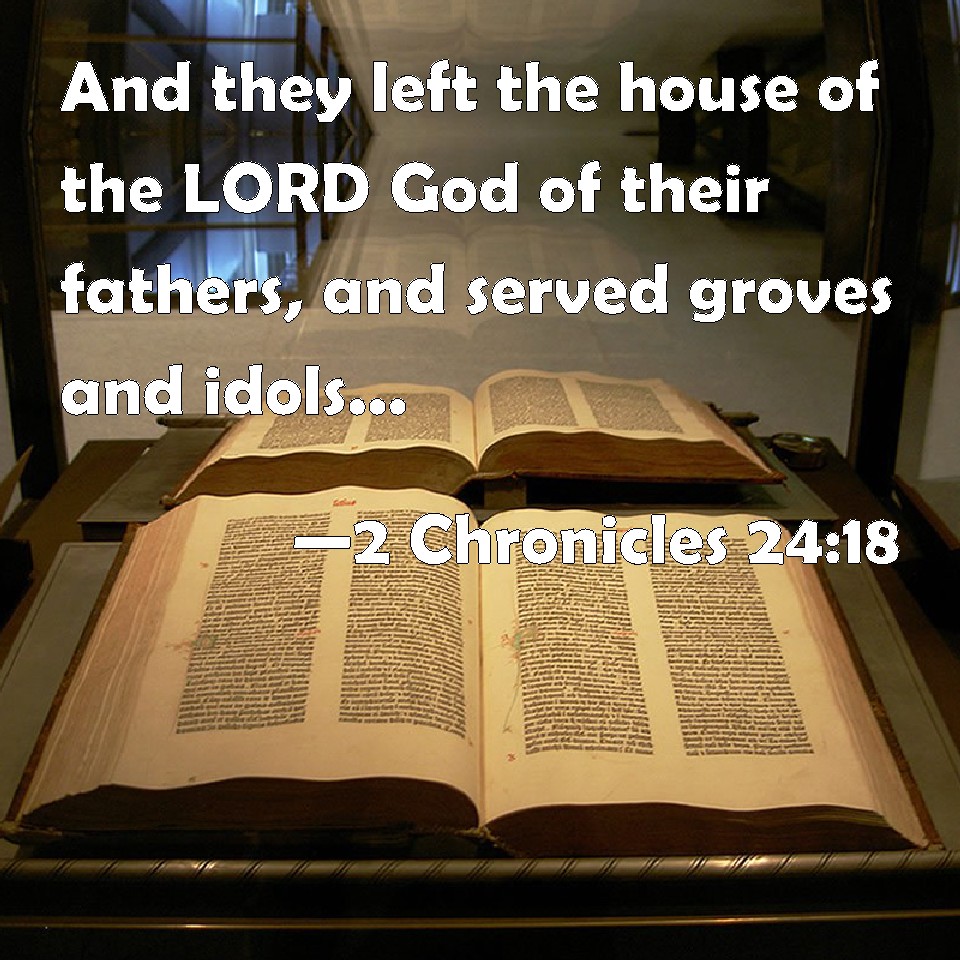 Choose a Background 2 Chronicles 24:18 And they left the house of the LORD God of their fathers, and served groves and idols: and wrath came on Judah and Jerusalem for this their trespass. KJV: And they left the house of the LORD God of their fathers, and served groves and idols: and wrath came upon Judah and Jerusalem for this their trespass. DRB: And they forsook the temple of the Lord the God of their fathers, and served groves and idols, and wrath came upon Juda and Jerusalem for this sin. DBT: And they forsook the house of Jehovah the God of their fathers, and served the Asherahs and idols; and wrath came upon Judah and Jerusalem for this their trespass. ERV: And they forsook the house of the LORD, the God of their fathers, and served the Asherim and the idols: and wrath came upon Judah and Jerusalem for this their guiltiness. WBT: And they left the house of the LORD God of their fathers, and served groves and idols: and wrath came upon Judah and Jerusalem for this their trespass. WEB: They forsook the house of Yahweh, the God of their fathers, and served the Asherim and the idols: and wrath came on Judah and Jerusalem for this their guiltiness. YLT: and they forsake the house of Jehovah, God of their fathers, and serve the shrines and the idols, and there is wrath upon Judah and Jerusalem for this their guilt.Links 2 Chronicles 24:18 NIV • 2 Chronicles 24:18 NLT • 2 Chronicles 24:18 ESV • 2 Chronicles 24:18 NASB • 2 Chronicles 24:18 KJV • 2 Chronicles 24:18 Interlinear • 2 Chronicles 24:18 Commentaries • 2 Chronicles 24:18 Parallel Texts • 2 Chronicles 24:18 Bible Apps • 2 Chronicles 24:18 Parallel • Bible Hub |