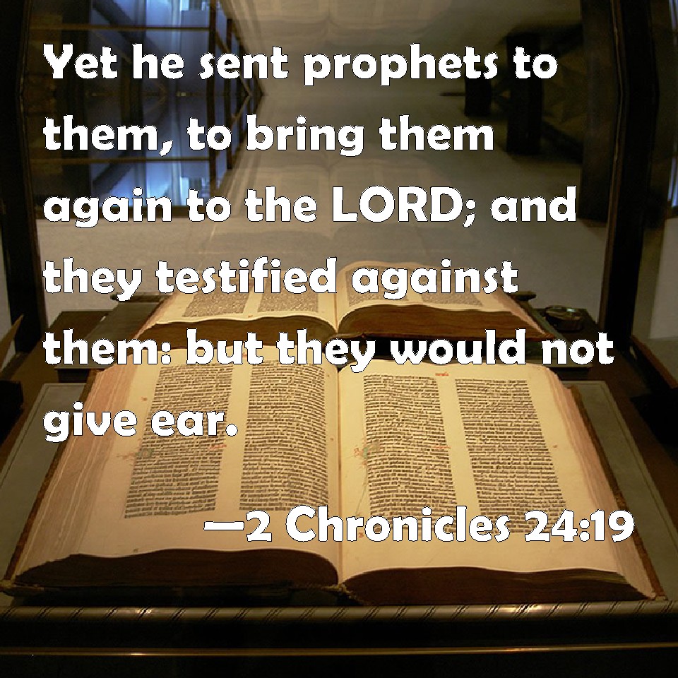 Choose a Background 2 Chronicles 24:19 Yet he sent prophets to them, to bring them again to the LORD; and they testified against them: but they would not give ear. KJV: Yet he sent prophets to them, to bring them again unto the LORD; and they testified against them: but they would not give ear. DRB: And he sent prophets to them to bring them back to the Lord, and they would not give ear when they testified against them. DBT: And he sent prophets among them to bring them again to Jehovah, and they testified against them; but they would not give ear. ERV: Yet he sent prophets to them, to bring them again unto the LORD; and they testified against them: but they would not give ear. WBT: Yet he sent prophets to them, to bring them again to the LORD; and they testified against them: but they would not give ear. WEB: Yet he sent prophets to them, to bring them again to Yahweh; and they testified against them: but they would not give ear. YLT: And He sendeth among them prophets, to bring them back unto Jehovah, and they testify against them, and they have not given ear;Links 2 Chronicles 24:19 NIV • 2 Chronicles 24:19 NLT • 2 Chronicles 24:19 ESV • 2 Chronicles 24:19 NASB • 2 Chronicles 24:19 KJV • 2 Chronicles 24:19 Interlinear • 2 Chronicles 24:19 Commentaries • 2 Chronicles 24:19 Parallel Texts • 2 Chronicles 24:19 Bible Apps • 2 Chronicles 24:19 Parallel • Bible Hub |