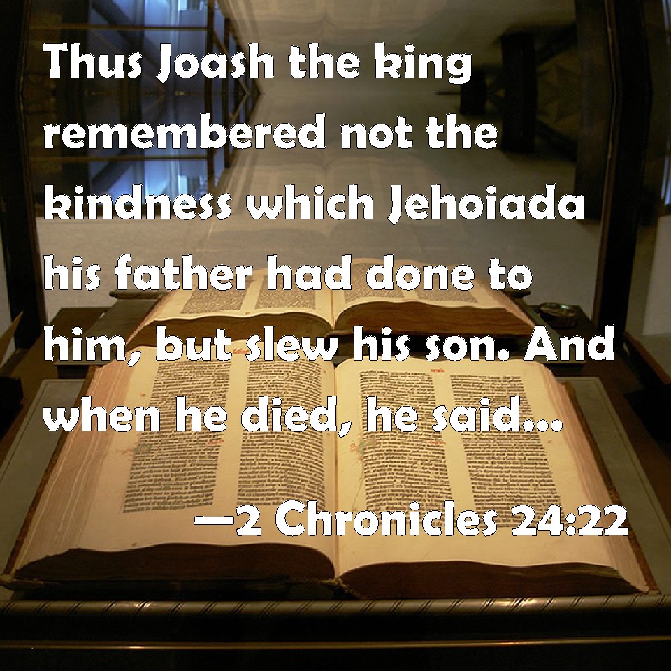 Choose a Background 2 Chronicles 24:22 Thus Joash the king remembered not the kindness which Jehoiada his father had done to him, but slew his son. And when he died, he said, The LORD look on it, and require it. KJV: Thus Joash the king remembered not the kindness which Jehoiada his father had done to him, but slew his son. And when he died, he said, The LORD look upon it, and require it. DRB: And king Joas did not remember the kindness that Joiada his father had done to him, but killed his son. And when he died, he said: The Lord see, and require it. DBT: And king Joash remembered not the kindness which Jehoiada his father had done to him, but slew his son. And when he died, he said, Jehovah see and require it! ERV: Thus Joash the king remembered not the kindness which Jehoiada his father had done to him, but slew his son. And when he died, he said, The LORD look upon it, and require it. WBT: Thus Joash the king remembered not the kindness which Jehoiada his father had done to him, but slew his son. And when he died, he said, The LORD look upon it, and require it. WEB: Thus Joash the king didn't remember the kindness which Jehoiada his father had done to him, but killed his son. When he died, he said, "May Yahweh look at it, and repay it." YLT: and Joash the king hath not remembered the kindness that Jehoiada his father did with him, and slayeth his son, and in his death he said, 'Jehovah doth see, and require.'Links 2 Chronicles 24:22 NIV • 2 Chronicles 24:22 NLT • 2 Chronicles 24:22 ESV • 2 Chronicles 24:22 NASB • 2 Chronicles 24:22 KJV • 2 Chronicles 24:22 Interlinear • 2 Chronicles 24:22 Commentaries • 2 Chronicles 24:22 Parallel Texts • 2 Chronicles 24:22 Bible Apps • 2 Chronicles 24:22 Parallel • Bible Hub |