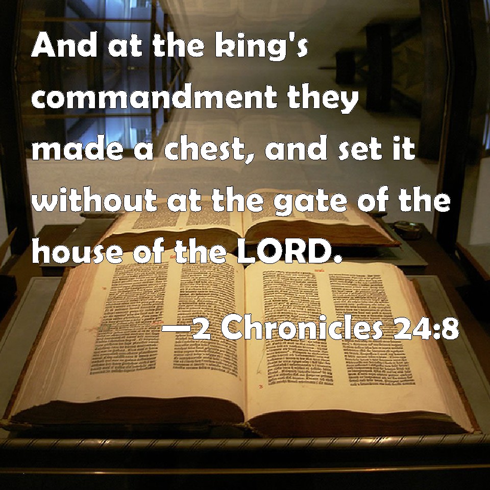 Choose a Background 2 Chronicles 24:8 And at the king's commandment they made a chest, and set it without at the gate of the house of the LORD. KJV: And at the king's commandment they made a chest, and set it without at the gate of the house of the LORD. DRB: And the king commanded, and they made a chest: and set it by the gate of the house of the Lord on the outside. DBT: And the king commanded, and they made a chest, and set it at the gate of the house of Jehovah without, ERV: So the king commanded, and they made a chest, and set it without at the gate of the house of the LORD. WBT: And at the king's commandment they made a chest, and set it without at the gate of the house of the LORD. WEB: So the king commanded, and they made a chest, and set it outside at the gate of the house of Yahweh. YLT: And the king speaketh, and they make one chest, and put it at the gate of the house of Jehovah without,Links 2 Chronicles 24:8 NIV • 2 Chronicles 24:8 NLT • 2 Chronicles 24:8 ESV • 2 Chronicles 24:8 NASB • 2 Chronicles 24:8 KJV • 2 Chronicles 24:8 Interlinear • 2 Chronicles 24:8 Commentaries • 2 Chronicles 24:8 Parallel Texts • 2 Chronicles 24:8 Bible Apps • 2 Chronicles 24:8 Parallel • Bible Hub |