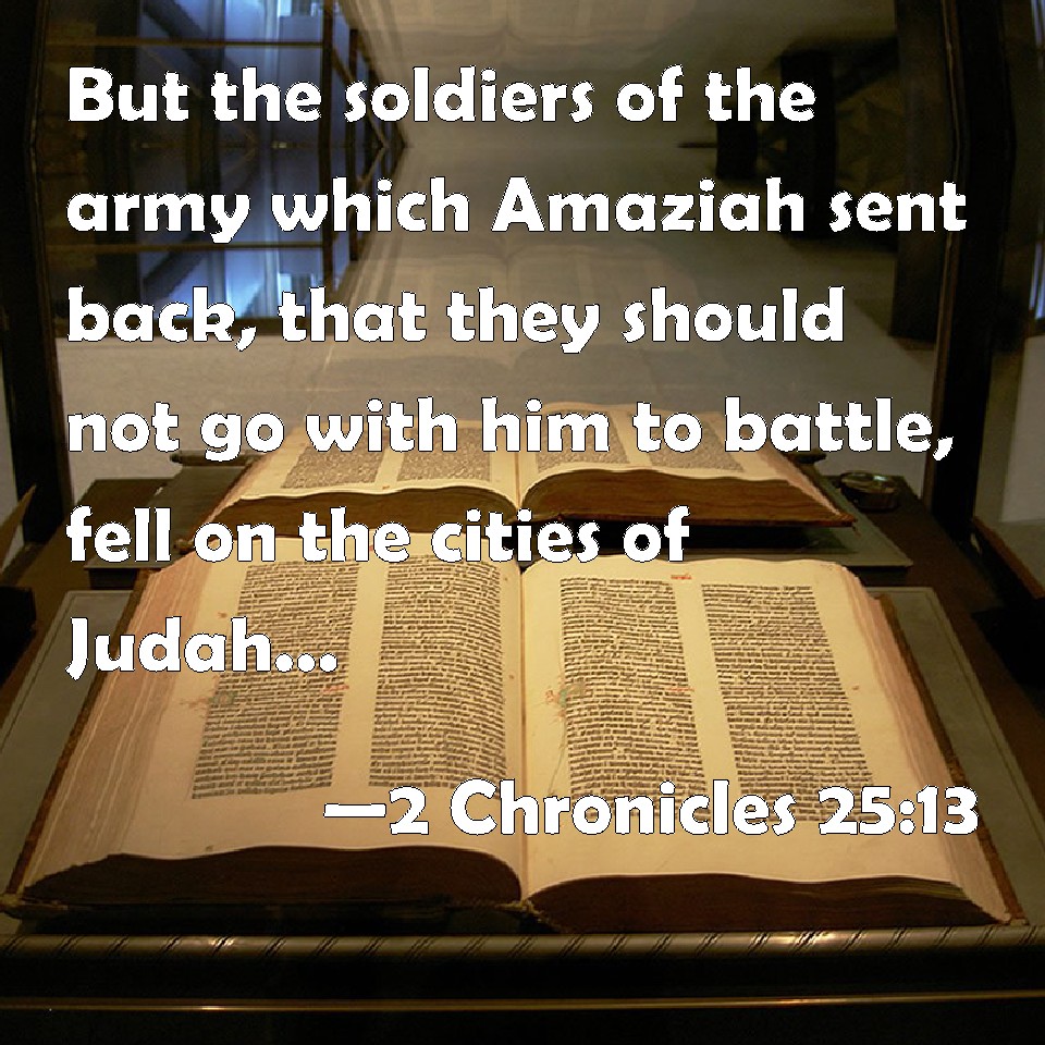 Choose a Background 2 Chronicles 25:13 But the soldiers of the army which Amaziah sent back, that they should not go with him to battle, fell on the cities of Judah, from Samaria even to Bethhoron, and smote three thousand of them, and took much spoil. KJV: But the soldiers of the army which Amaziah sent back, that they should not go with him to battle, fell upon the cities of Judah, from Samaria even unto Bethhoron, and smote three thousand of them, and took much spoil. DRB: But that army which Amasias had sent back, that they should not go with him to battle, spread themselves among the cities of Juda, from Samaria to Beth-horon, and having killed three thousand took away much spoil. DBT: But those of the troop that Amaziah had sent back, that they should not go with him to battle, fell upon the cities of Judah from Samaria as far as Beth-horon, and smote three thousand of them, and took much spoil. ERV: But the men of the army which Amaziah sent back, that they should not go with him to battle, fell upon the cities of Judah, from Samaria even unto Beth-horon, and smote of them three thousand, and took much spoil. WBT: But the soldiers of the army whom Amaziah sent back, that they should not go with him to battle, fell upon the cities of Judah, from Samaria even to Beth-horon, and smote three thousand of them, and took much spoil. WEB: But the men of the army whom Amaziah sent back, that they should not go with him to battle, fell on the cities of Judah, from Samaria even to Beth Horon, and struck of them three thousand, and took much spoil. YLT: And the sons of the troop that Amaziah hath sent back from going with him to battle — they rush against cities of Judah, from Samaria even unto Beth-Horon, and smite of them three thousand, and seize much prey.Links 2 Chronicles 25:13 NIV • 2 Chronicles 25:13 NLT • 2 Chronicles 25:13 ESV • 2 Chronicles 25:13 NASB • 2 Chronicles 25:13 KJV • 2 Chronicles 25:13 Interlinear • 2 Chronicles 25:13 Commentaries • 2 Chronicles 25:13 Parallel Texts • 2 Chronicles 25:13 Bible Apps • 2 Chronicles 25:13 Parallel • Bible Hub |