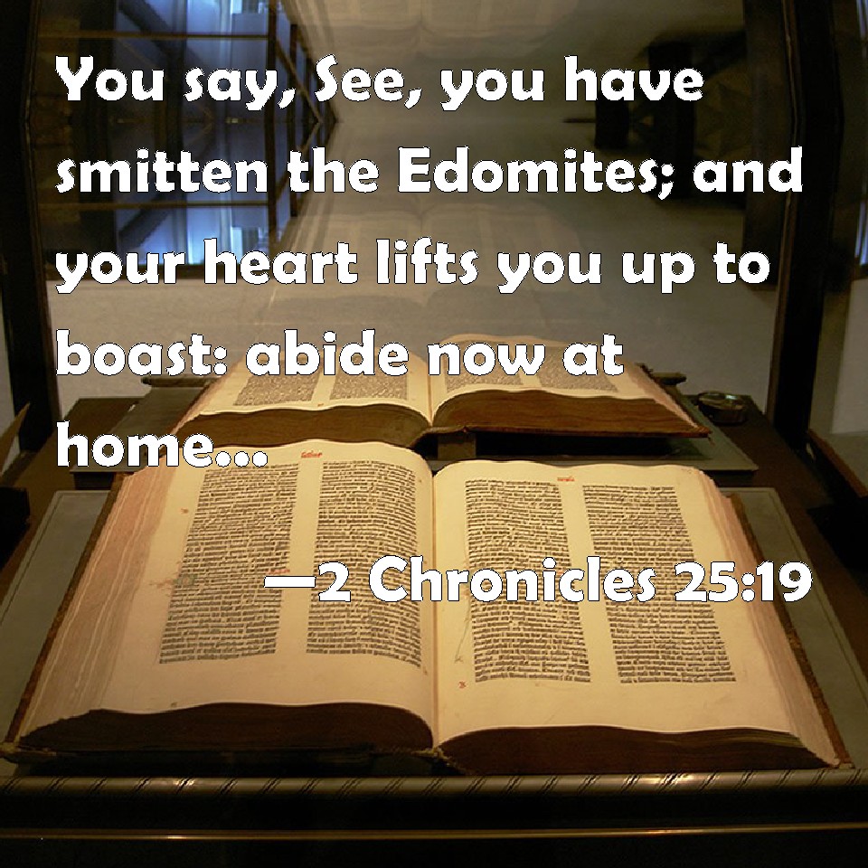 Choose a Background 2 Chronicles 25:19 You say, See, you have smitten the Edomites; and your heart lifts you up to boast: abide now at home; why should you meddle to your hurt, that you should fall, even you, and Judah with you? KJV: Thou sayest, Lo, thou hast smitten the Edomites; and thine heart lifteth thee up to boast: abide now at home; why shouldest thou meddle to thine hurt, that thou shouldest fall, even thou, and Judah with thee? DRB: Thou hast said: I have overthrown Edom, and therefore thy heart is lifted up with pride : stay at home, why dost thou provoke evil against thee, that both thou shouldst fall and Juda with thee. DBT: Thou thinkest, Lo, thou hast smitten Edom; and thy heart has lifted thee up to boast: abide now at home; why shouldest thou contend with misfortune, that thou shouldest fall, thou and Judah with thee? ERV: Thou sayest, Lo, thou hast smitten Edom; and thine heart lifteth thee up to boast: abide now at home; why shouldest thou meddle to thy hurt, that thou shouldest fall, even thou, and Judah with thee? WBT: Thou sayest, Lo, thou hast smitten the Edomites; and thy heart lifteth thee up to boast: abide now at home; why shouldst thou meddle to thy hurt, that thou shouldst fall, even thou, and Judah with thee? WEB: You say to yourself that you have struck Edom; and your heart lifts you up to boast. Now stay at home. Why should you meddle with trouble, that you should fall, even you, and Judah with you?'" YLT: Thou hast said, Lo, I have smitten Edom; and thy heart hath lifted thee up to boast; now, abide in thy house, why dost thou stir thyself up in evil, that thou hast fallen, thou, and Judah with thee?'Links 2 Chronicles 25:19 NIV • 2 Chronicles 25:19 NLT • 2 Chronicles 25:19 ESV • 2 Chronicles 25:19 NASB • 2 Chronicles 25:19 KJV • 2 Chronicles 25:19 Interlinear • 2 Chronicles 25:19 Commentaries • 2 Chronicles 25:19 Parallel Texts • 2 Chronicles 25:19 Bible Apps • 2 Chronicles 25:19 Parallel • Bible Hub |