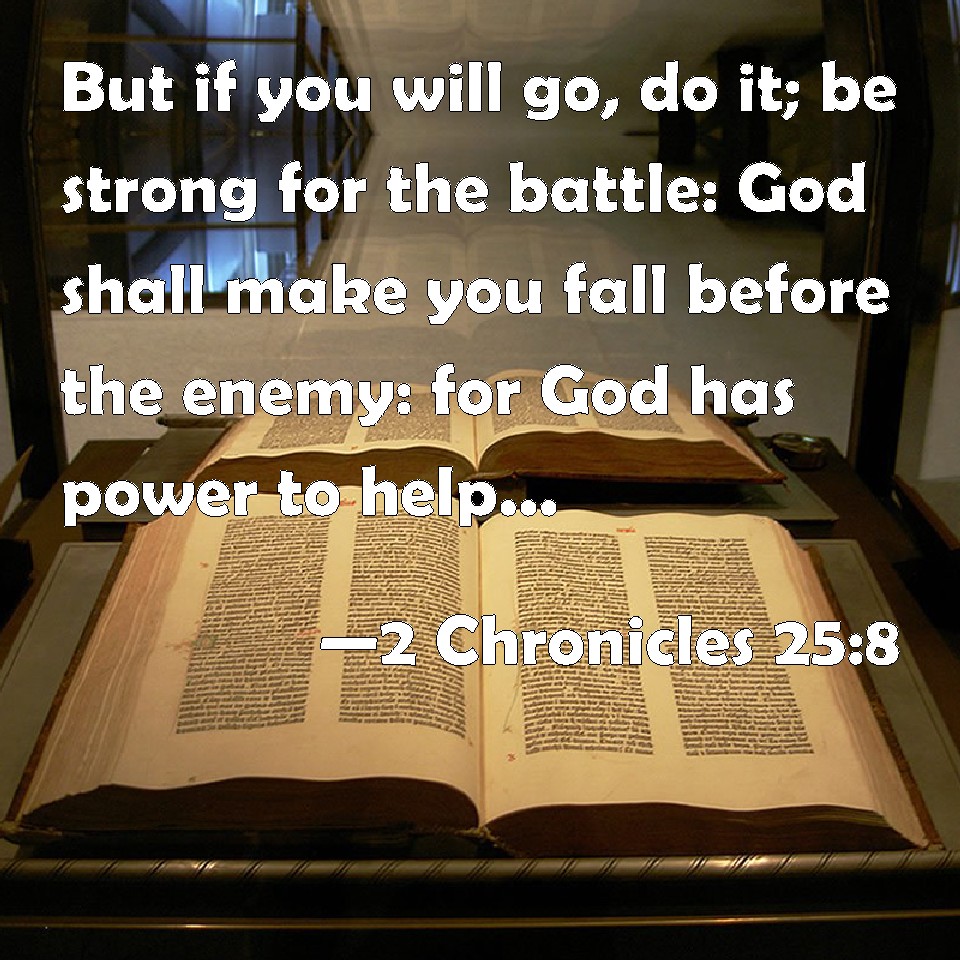 Choose a Background 2 Chronicles 25:8 But if you will go, do it; be strong for the battle: God shall make you fall before the enemy: for God has power to help, and to cast down. KJV: But if thou wilt go, do it, be strong for the battle: God shall make thee fall before the enemy: for God hath power to help, and to cast down. DRB: And if thou think that battles consist in the strength of the army, God will make thee to be overcome by the enemies: for it belongeth to God both to help, and to put to flight. DBT: But if thou wilt go, do it; be strong for the battle: God will make thee fall before the enemy, for there is with God power to help and to cast down. ERV: But if thou wilt go, do valiantly, be strong for the battle: God shall cast thee down before the enemy; for God hath power to help, and to cast down. WBT: But if thou wilt go, do it, be strong for the battle: God will make thee fall before the enemy: for God hath power to help, and to cast down. WEB: But if you will go, take action, be strong for the battle. God will overthrow you before the enemy; for God has power to help, and to overthrow." YLT: but if thou art going — do it, be strong for battle, God doth cause thee to stumble before an enemy, for there is power in God to help, and to cause to stumble.'Links 2 Chronicles 25:8 NIV • 2 Chronicles 25:8 NLT • 2 Chronicles 25:8 ESV • 2 Chronicles 25:8 NASB • 2 Chronicles 25:8 KJV • 2 Chronicles 25:8 Interlinear • 2 Chronicles 25:8 Commentaries • 2 Chronicles 25:8 Parallel Texts • 2 Chronicles 25:8 Bible Apps • 2 Chronicles 25:8 Parallel • Bible Hub |