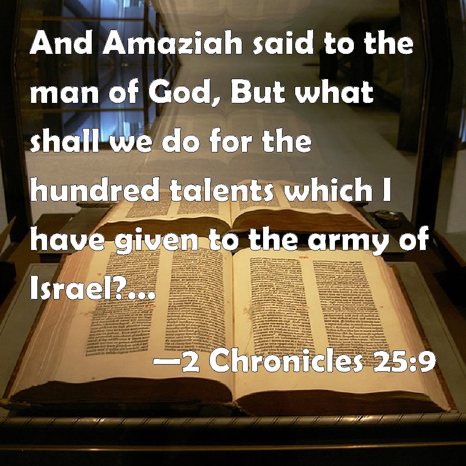Choose a Background 2 Chronicles 25:9 And Amaziah said to the man of God, But what shall we do for the hundred talents which I have given to the army of Israel? And the man of God answered, The LORD is able to give you much more than this. KJV: And Amaziah said to the man of God, But what shall we do for the hundred talents which I have given to the army of Israel? And the man of God answered, The LORD is able to give thee much more than this. DRB: And Amasias said to the man of God: What will then become of the hundred talents which I have given to the soldiers of Israeli and the man of God answered him: The Lord is rich enough to be able to give thee much more than this. DBT: And Amaziah said to the man of God, But what is to be done for the hundred talents which I have given to the troop of Israel? And the man of God said, Jehovah is able to give thee much more than this. ERV: And Amaziah said to the man of God, But what shall we do for the hundred talents which I have given to the army of Israel? And the man of God answered, The LORD is able to give thee much more than this. WBT: And Amaziah said to the man of God, But what shall we do for the hundred talents which I have given to the army of Israel? And the man of God answered, The LORD is able to give thee much more than this. WEB: Amaziah said to the man of God, "But what shall we do for the hundred talents which I have given to the army of Israel?" The man of God answered, "Yahweh is able to give you much more than this." YLT: And Amaziah saith to the man of God, 'And what — to do for the hundred talents that I have given to the troop of Israel?' And the man of God saith, 'Jehovah hath more to give to thee than this.'Links 2 Chronicles 25:9 NIV • 2 Chronicles 25:9 NLT • 2 Chronicles 25:9 ESV • 2 Chronicles 25:9 NASB • 2 Chronicles 25:9 KJV • 2 Chronicles 25:9 Interlinear • 2 Chronicles 25:9 Commentaries • 2 Chronicles 25:9 Parallel Texts • 2 Chronicles 25:9 Bible Apps • 2 Chronicles 25:9 Parallel • Bible Hub |