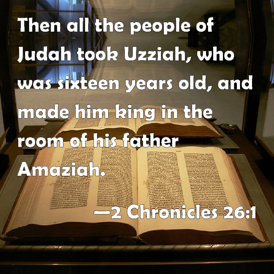 Choose a Background 2 Chronicles 26:1 Then all the people of Judah took Uzziah, who was sixteen years old, and made him king in the room of his father Amaziah. KJV: Then all the people of Judah took Uzziah, who was sixteen years old, and made him king in the room of his father Amaziah. DRB: And all the people of Juda took his son Ozias, who was sixteen years old, and made him king in the room of Amasias his father. DBT: And all the people of Judah took Uzziah, who was sixteen years old, and made him king instead of his father Amaziah. ERV: And all the people of Judah took Uzziah, who was sixteen years old, and made him king in the room of his father Amaziah. WBT: Then all the people of Judah took Uzziah, who was sixteen years old, and made him king in the room of his father Amaziah. WEB: All the people of Judah took Uzziah, who was sixteen years old, and made him king in the place of his father Amaziah. YLT: And all the people of Judah take Uzziah (and he is a son of sixteen years), and cause him to reign instead of his father Amaziah.Links 2 Chronicles 26:1 NIV • 2 Chronicles 26:1 NLT • 2 Chronicles 26:1 ESV • 2 Chronicles 26:1 NASB • 2 Chronicles 26:1 KJV • 2 Chronicles 26:1 Interlinear • 2 Chronicles 26:1 Commentaries • 2 Chronicles 26:1 Parallel Texts • 2 Chronicles 26:1 Bible Apps • 2 Chronicles 26:1 Parallel • Bible Hub |