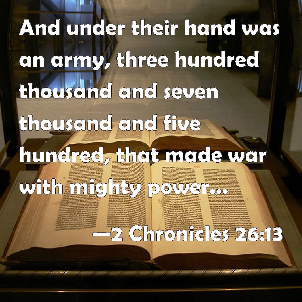 Choose a Background 2 Chronicles 26:13 And under their hand was an army, three hundred thousand and seven thousand and five hundred, that made war with mighty power, to help the king against the enemy. KJV: And under their hand was an army, three hundred thousand and seven thousand and five hundred, that made war with mighty power, to help the king against the enemy. DRB: And the whole army under them three hundred and seven thousand five hundred: who were fit for war, and fought for the king against the enemy. DBT: And under their hand was an army-host of three hundred and seven thousand five hundred, that made war with mighty power to help the king against the enemy. ERV: And under their hand was a trained army, three hundred thousand and seven thousand and five hundred, that made war with mighty power, to help the king against the enemy. WBT: And under their hand was an army, three hundred thousand and seven thousand and five hundred, that made war with mighty power, to help the king against the enemy. WEB: Under their hand was an army, three hundred thousand and seven thousand and five hundred, who made war with mighty power, to help the king against the enemy. YLT: and by their hand is the force of the host, three hundred thousand, and seven thousand, and five hundred warriors, with mighty power to give help to the king against the enemy.Links 2 Chronicles 26:13 NIV • 2 Chronicles 26:13 NLT • 2 Chronicles 26:13 ESV • 2 Chronicles 26:13 NASB • 2 Chronicles 26:13 KJV • 2 Chronicles 26:13 Interlinear • 2 Chronicles 26:13 Commentaries • 2 Chronicles 26:13 Parallel Texts • 2 Chronicles 26:13 Bible Apps • 2 Chronicles 26:13 Parallel • Bible Hub |