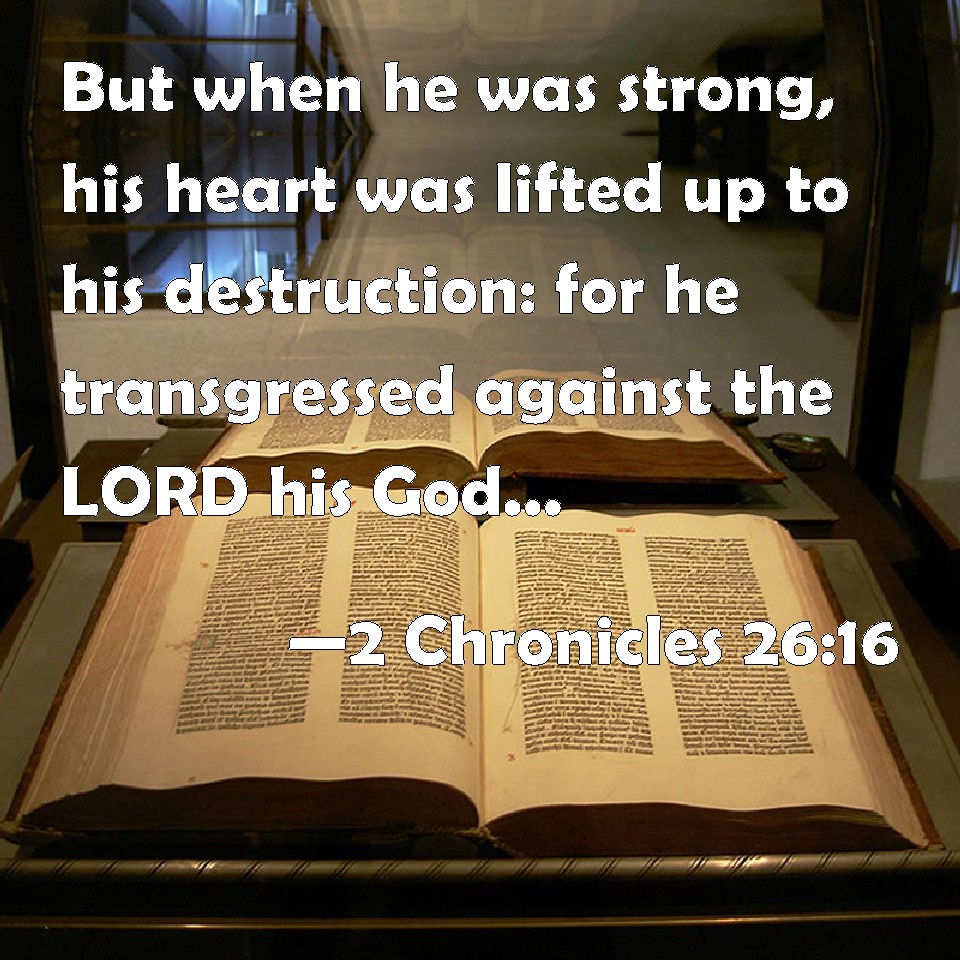 Choose a Background 2 Chronicles 26:16 But when he was strong, his heart was lifted up to his destruction: for he transgressed against the LORD his God, and went into the temple of the LORD to burn incense on the altar of incense. KJV: But when he was strong, his heart was lifted up to his destruction: for he transgressed against the LORD his God, and went into the temple of the LORD to burn incense upon the altar of incense. DRB: But when he was made strong, his heart was lifted up to his destruction, and he neglected the Lord his God: and going into the temple of the Lord, he had a mind to burn incense upon the altar of incense. DBT: But when he became strong his heart was lifted up to his downfall; and he transgressed against Jehovah his God, and went into the temple of Jehovah to burn incense upon the altar of incense. ERV: But when he was strong, his heart was lifted up so that he did corruptly, and he trespassed against the LORD his God; for he went into the temple of the LORD to burn incense upon the altar of incense. WBT: But when he was strong, his heart was lifted up to his destruction: for he transgressed against the LORD his God, and went into the temple of the LORD to burn incense upon the altar of incense. WEB: But when he was strong, his heart was lifted up, so that he did corruptly, and he trespassed against Yahweh his God; for he went into the temple of Yahweh to burn incense on the altar of incense. YLT: And at his being strong his heart hath been high unto destruction, and he trespasseth against Jehovah his God, and goeth in unto the temple of Jehovah to make perfume upon the altar of perfume.Links 2 Chronicles 26:16 NIV • 2 Chronicles 26:16 NLT • 2 Chronicles 26:16 ESV • 2 Chronicles 26:16 NASB • 2 Chronicles 26:16 KJV • 2 Chronicles 26:16 Interlinear • 2 Chronicles 26:16 Commentaries • 2 Chronicles 26:16 Parallel Texts • 2 Chronicles 26:16 Bible Apps • 2 Chronicles 26:16 Parallel • Bible Hub |