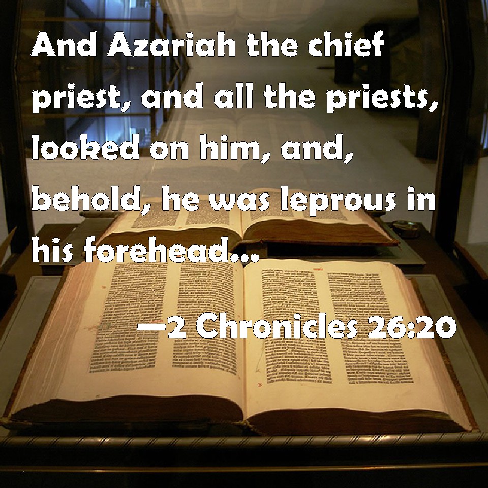 Choose a Background 2 Chronicles 26:20 And Azariah the chief priest, and all the priests, looked on him, and, behold, he was leprous in his forehead, and they thrust him out from there; yes, himself hurried also to go out, because the LORD had smitten him. KJV: And Azariah the chief priest, and all the priests, looked upon him, and, behold, he was leprous in his forehead, and they thrust him out from thence; yea, himself hasted also to go out, because the LORD had smitten him. DRB: And Azarias the high priest, and all the rest of the priests looked upon him, and saw the leprosy in his forehead, and they made haste to thrust him out. Yea himself also being frightened, hasted to go out, because he had quickly felt the stroke of the Lord. DBT: And Azariah the chief priest and all the priests looked upon him, and behold, he was leprous in his forehead, and they thrust him out from thence; even he himself hasted to go out, because Jehovah had smitten him. ERV: And Azariah the chief priest, and all the priests, looked upon him, and, behold, he was leprous in his forehead, and they thrust him out quickly from thence; yea, himself hasted also to go out, because the LORD had smitten him. WBT: And Azariah the chief priest, and all the priests looked upon him, and behold, he was leprous in his forehead, and they thrust him out from thence; yea, himself hasted also to go out, because the LORD had smitten him. WEB: Azariah the chief priest, and all the priests, looked on him, and behold, he was leprous in his forehead, and they thrust him out quickly from there; yes, himself hurried also to go out, because Yahweh had struck him. YLT: And Azariah the head priest looketh unto him, and all the priests, and lo, he is leprous in his forehead, and they hasten him thence, and also he himself hath hastened to go out, for Jehovah hath plagued him.Links 2 Chronicles 26:20 NIV • 2 Chronicles 26:20 NLT • 2 Chronicles 26:20 ESV • 2 Chronicles 26:20 NASB • 2 Chronicles 26:20 KJV • 2 Chronicles 26:20 Interlinear • 2 Chronicles 26:20 Commentaries • 2 Chronicles 26:20 Parallel Texts • 2 Chronicles 26:20 Bible Apps • 2 Chronicles 26:20 Parallel • Bible Hub |