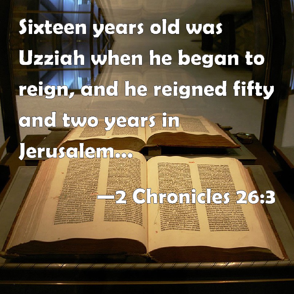2 Chronicles 26:3 Sixteen years old was Uzziah when he began to reign, and he reigned fifty and two years in Jerusalem. His mother's name also was Jecoliah of Jerusalem.