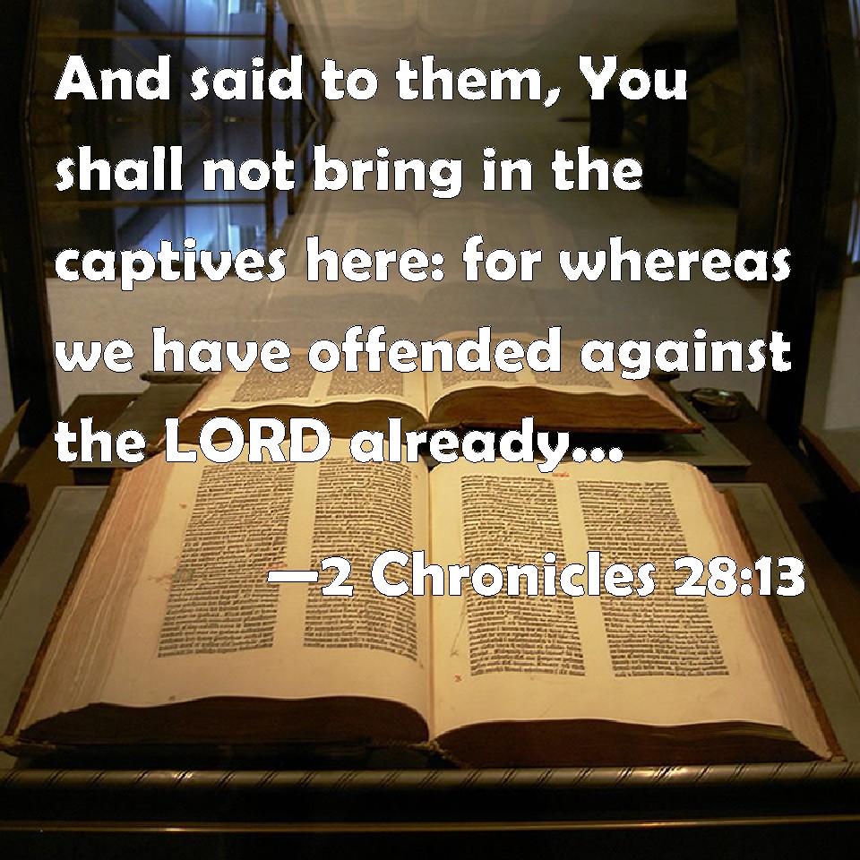Choose a Background 2 Chronicles 28:13 And said to them, You shall not bring in the captives here: for whereas we have offended against the LORD already, you intend to add more to our sins and to our trespass: for our trespass is great, and there is fierce wrath against Israel. KJV: And said unto them, Ye shall not bring in the captives hither: for whereas we have offended against the LORD already, ye intend to add more to our sins and to our trespass: for our trespass is great, and there is fierce wrath against Israel. DRB: And they said to them: You shall not bring in the captives hither, lest we sin against the Lord. Why will you add to our sins, and heap up upon our former offences? for the sin is great, and the fierce anger of the Lord hangeth over Israel. DBT: and said to them, Ye shall not bring in the captives hither; because, for our guilt before Jehovah, ye think to increase our sins and our trespasses: for our trespass is great, and fierce wrath is upon Israel. ERV: and said unto them, Ye shall not bring in the captives hither: for ye purpose that which will bring upon us a trespass against the LORD, to add unto our sins and to our trespass: for our trespass is great, and there is fierce wrath against Israel. WBT: And said to them, Ye shall not bring in the captives hither: for whereas we have offended against the LORD already, ye intend to add more to our sins and to our trespass: for our trespass is great, and there is fierce wrath against Israel. WEB: and said to them, "You shall not bring in the captives here: for you purpose that which will bring on us a trespass against Yahweh, to add to our sins and to our trespass; for our trespass is great, and there is fierce wrath against Israel." YLT: and say to them, 'Ye do not bring in the captives hither, for, to guilt against Jehovah on us, ye are saying to add unto our sin and unto our guilt? for abundant is the guilt we have, and the fierceness of anger on Israel.'Links 2 Chronicles 28:13 NIV • 2 Chronicles 28:13 NLT • 2 Chronicles 28:13 ESV • 2 Chronicles 28:13 NASB • 2 Chronicles 28:13 KJV • 2 Chronicles 28:13 Interlinear • 2 Chronicles 28:13 Commentaries • 2 Chronicles 28:13 Parallel Texts • 2 Chronicles 28:13 Bible Apps • 2 Chronicles 28:13 Parallel • Bible Hub |