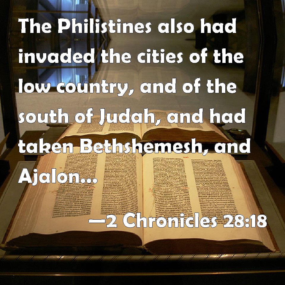 Choose a Background 2 Chronicles 28:18 The Philistines also had invaded the cities of the low country, and of the south of Judah, and had taken Bethshemesh, and Ajalon, and Gederoth, and Shocho with the villages thereof, and Timnah with the villages thereof, Gimzo also and the villages thereof: and they dwelled there. KJV: The Philistines also had invaded the cities of the low country, and of the south of Judah, and had taken Bethshemesh, and Ajalon, and Gederoth, and Shocho with the villages thereof, and Timnah with the villages thereof, Gimzo also and the villages thereof: and they dwelt there. DRB: The Philistines also spread themselves among the cities of the plains, and to the south of Juda: and they took Bethsames, and Aialon, and Gaderoth, and Socho, and Thamnan, and Gamzo, with their villages, and they dwelt in them. DBT: And the Philistines invaded the cities of the lowland, and of the south of Judah, and took Beth-shemesh, and Ajalon, and Gederoth, and Socho and its dependent villages, and Timnah and its dependent villages, and Guimzo and its dependent villages; and they dwelt there. ERV: The Philistines also had invaded the cities of the lowland, and of the South of Judah, and had taken Beth-shemesh, and Aijalon, and Gederoth, and Soco with the towns thereof, and Timnah with the towns thereof, Gimzo also and the towns thereof: and they dwelt there. WBT: The Philistines also had invaded the cities of the low country, and of the south of Judah, and had taken Beth-shemesh, and Ajalon, and Gederoth, and Shocho with its villages, and Timnah with its villages, Gimzo also and its villages: and they dwelt there. WEB: The Philistines also had invaded the cities of the lowland, and of the South of Judah, and had taken Beth Shemesh, and Aijalon, and Gederoth, and Soco with its towns, and Timnah with its towns, Gimzo also and its towns: and they lived there. YLT: And the Philistines have rushed against the cities of the low country, and of the south of Judah, and capture Beth-Shemesh, and Aijalon, and Gederoth, and Shocho and its villages, and Timnah and its villages, and Gimzo and its villages, and dwell there,Links 2 Chronicles 28:18 NIV • 2 Chronicles 28:18 NLT • 2 Chronicles 28:18 ESV • 2 Chronicles 28:18 NASB • 2 Chronicles 28:18 KJV • 2 Chronicles 28:18 Interlinear • 2 Chronicles 28:18 Commentaries • 2 Chronicles 28:18 Parallel Texts • 2 Chronicles 28:18 Bible Apps • 2 Chronicles 28:18 Parallel • Bible Hub |