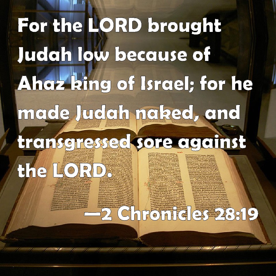 Choose a Background 2 Chronicles 28:19 For the LORD brought Judah low because of Ahaz king of Israel; for he made Judah naked, and transgressed sore against the LORD. KJV: For the LORD brought Judah low because of Ahaz king of Israel; for he made Judah naked, and transgressed sore against the LORD. DRB: For the Lord had humbled Juda because of Achaz the king of Juda, for he had stripped it of help, and had contemned the Lord. DBT: For Jehovah humbled Judah because of Ahaz king of Israel, for he had made Judah lawless, and transgressed much against Jehovah. ERV: For the LORD brought Judah low because of Ahaz king of Israel; for he had dealt wantonly in Judah, and trespassed sore against the LORD. WBT: For the LORD brought Judah low because of Ahaz king of Israel: for he made Judah naked, and greatly transgressed against the LORD. WEB: For Yahweh brought Judah low because of Ahaz king of Israel; for he had dealt wantonly in Judah, and trespassed severely against Yahweh. YLT: for Jehovah hath humbled Judah because of Ahaz king of Israel, for he made free with Judah, even to commit a trespass against Jehovah.Links 2 Chronicles 28:19 NIV • 2 Chronicles 28:19 NLT • 2 Chronicles 28:19 ESV • 2 Chronicles 28:19 NASB • 2 Chronicles 28:19 KJV • 2 Chronicles 28:19 Interlinear • 2 Chronicles 28:19 Commentaries • 2 Chronicles 28:19 Parallel Texts • 2 Chronicles 28:19 Bible Apps • 2 Chronicles 28:19 Parallel • Bible Hub |