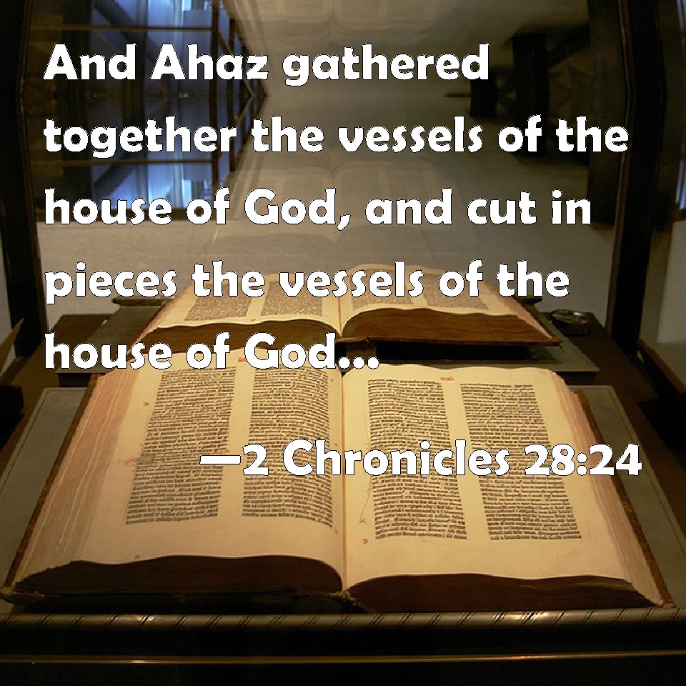 Choose a Background 2 Chronicles 28:24 And Ahaz gathered together the vessels of the house of God, and cut in pieces the vessels of the house of God, and shut up the doors of the house of the LORD, and he made him altars in every corner of Jerusalem. KJV: And Ahaz gathered together the vessels of the house of God, and cut in pieces the vessels of the house of God, and shut up the doors of the house of the LORD, and he made him altars in every corner of Jerusalem. DRB: Then Achaz having taken away all the vessels of the house of God, and broken them, shut up the doors of the temple of God, and made himself altars in all the corners of Jerusalem. DBT: And Ahaz gathered the vessels of the house of God, and cut in pieces the vessels of the house of God, and closed the doors of the house of Jehovah, and he made for himself altars in every corner of Jerusalem. ERV: And Ahaz gathered together the vessels of the house of God, and cut in pieces the vessels of the house of God, and shut up the doors of the house of the LORD; and he made him altars in every corner of Jerusalem. WBT: And Ahaz collected the vessels of the house of God, and cut in pieces the vessels of the house of God, and shut up the doors of the house of the LORD, and he made for himself altars in every corner of Jerusalem. WEB: Ahaz gathered together the vessels of the house of God, and cut in pieces the vessels of the house of God, and shut up the doors of the house of Yahweh; and he made him altars in every corner of Jerusalem. YLT: And Ahaz gathereth the vessels of the house of God, and cutteth in pieces the vessels of the house of God, and shutteth the doors of the house of Jehovah, and maketh to himself altars in every corner in Jerusalem.Links 2 Chronicles 28:24 NIV • 2 Chronicles 28:24 NLT • 2 Chronicles 28:24 ESV • 2 Chronicles 28:24 NASB • 2 Chronicles 28:24 KJV • 2 Chronicles 28:24 Interlinear • 2 Chronicles 28:24 Commentaries • 2 Chronicles 28:24 Parallel Texts • 2 Chronicles 28:24 Bible Apps • 2 Chronicles 28:24 Parallel • Bible Hub |